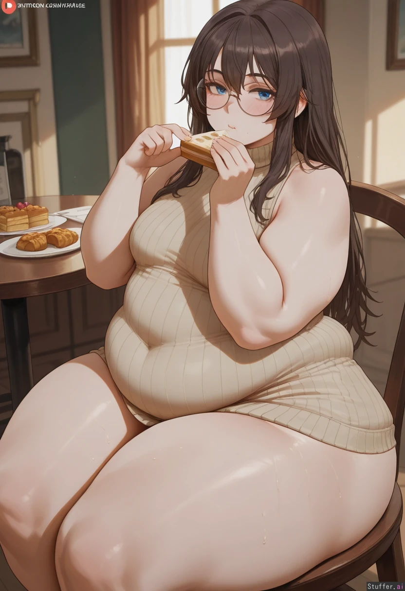 best quality), (high rating), absurd res, high res, detailed, ultra quality, (high quality), masterpiece, stunning beauty, (((detailed face))), intricate detail, beautiful face, exquisite detail, absurd resolution, correct anatomy, 8k, high definition picture, (highly detailed face), highly detailed skin texture, detailed background, (((perfect human anatomy))), ((perfect proportions)), better-with-salt(artist), c.cu(artist), shexyo(artist), mdf_an(artist), araneesama(artist), cutesexyrobutts(artist), w-oo-t(artist), assthethick(artist), butty-butter(artist), **Character:** 1girl. Solo. **Body Appearance:** Small breasts, ((wide hips:1.9)), bottom heavy, love handles, ((chubby belly:1.0)), ((obese:1.0)), ((bulky limbs)), ((thick thighs:1.9)), ((fat arms:1.5)), ((obese legs:1.9)), ((pale skin)), ((round chubby face:1.4))), (enormous ass:1.7), (extreme ass:1.7) **Eye:** blue eyes. **Emotions:** blush, horny, sweaty, ((embarrassed)) *Hair/Styles:** long hair, dark blonde, messy, **Clothes:** skin tight dress, (((fully clothed))), (((sweater dress))), ((((belly covered)))), round glasses, ((body covered)), jewelry **Setting:** Table, ((night)), cake, pastries, icecream, **Actions:** (sitting), sexual pose, looking at viewer, eating, **Perspective::** ((From above)), ((from side)), close to viewer,