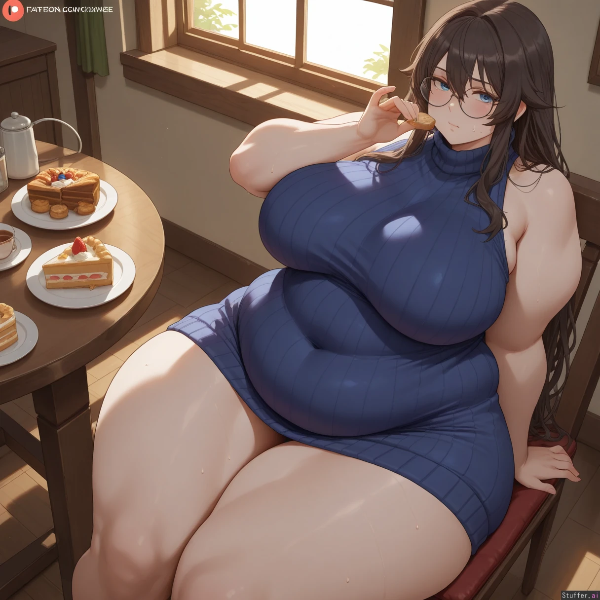 best quality), (high rating), absurd res, high res, detailed, ultra quality, (high quality), masterpiece, stunning beauty, (((detailed face))), intricate detail, beautiful face, exquisite detail, absurd resolution, correct anatomy, 8k, high definition picture, (highly detailed face), highly detailed skin texture, detailed background, (((perfect human anatomy))), ((perfect proportions)), better-with-salt(artist), c.cu(artist), shexyo(artist), mdf_an(artist), araneesama(artist), cutesexyrobutts(artist), w-oo-t(artist), assthethick(artist), butty-butter(artist), **Character:** 1girl. Solo. **Body Appearance:** ((wide hips:1.8)), bottomheavy, fat rolls, love handles, ((chubby belly:1.4)), ((obese:1.4)), ((bulky limbs)), ((thick thighs:1.8)), ((fat arms:1.5)), ((obese legs:1.8)), ((pale skin)), ((round chubby face:1.6))), ((fat ass:1.6)), **Eye:** blue eyes. **Emotions:** blush, horny, sweaty, ((embarrassed)) *Hair/Styles:** long hair, dark blonde, messy, **Clothes:** skin tight dress, (((fully clothed))), (((sweater dress))), ((((belly covered)))), round glasses, ((body covered)), jewelry **Setting:** Table, ((night)), cake, pastries, icecream, **Actions:** (sitting), sexual pose, looking at viewer, eating, **Perspective::** ((From above)), ((from side)), close to viewer,