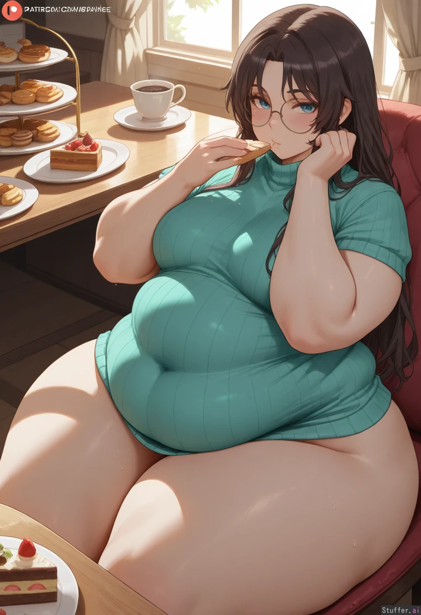 best quality), (high rating), absurd res, high res, detailed, ultra quality, (high quality), masterpiece, stunning beauty, (((detailed face))), intricate detail, beautiful face, exquisite detail, absurd resolution, correct anatomy, 8k, high definition picture, (highly detailed face), highly detailed skin texture, detailed background, (((perfect human anatomy))), ((perfect proportions)), better-with-salt(artist), c.cu(artist), shexyo(artist), mdf_an(artist), araneesama(artist), cutesexyrobutts(artist), w-oo-t(artist), assthethick(artist), butty-butter(artist), **Character:** 1girl. Solo. **Body Appearance:** Small breasts, ((wide hips:1.9)), bottom heavy, love handles, ((chubby belly:1.9)), ((obese:1.9)), ((bulky limbs)), ((thick thighs:1.9)), ((fat arms:1.5)), ((obese legs:1.9)), ((pale skin)), ((round chubby face:1.2))), (enormous ass:1.7), (extreme ass:1.7) **Eye:** blue eyes. **Emotions:** blush, horny, sweaty, ((embarrassed)) *Hair/Styles:** long hair, dark blonde, messy, **Clothes:** skin tight dress, (((fully clothed))), (((sweater dress))), ((((belly covered)))), round glasses, ((body covered)), jewelry **Setting:** Table, ((night)), cake, pastries, icecream, **Actions:** (sitting), sexual pose, looking at viewer, eating, **Perspective::** ((From above)), ((from side)), close to viewer,