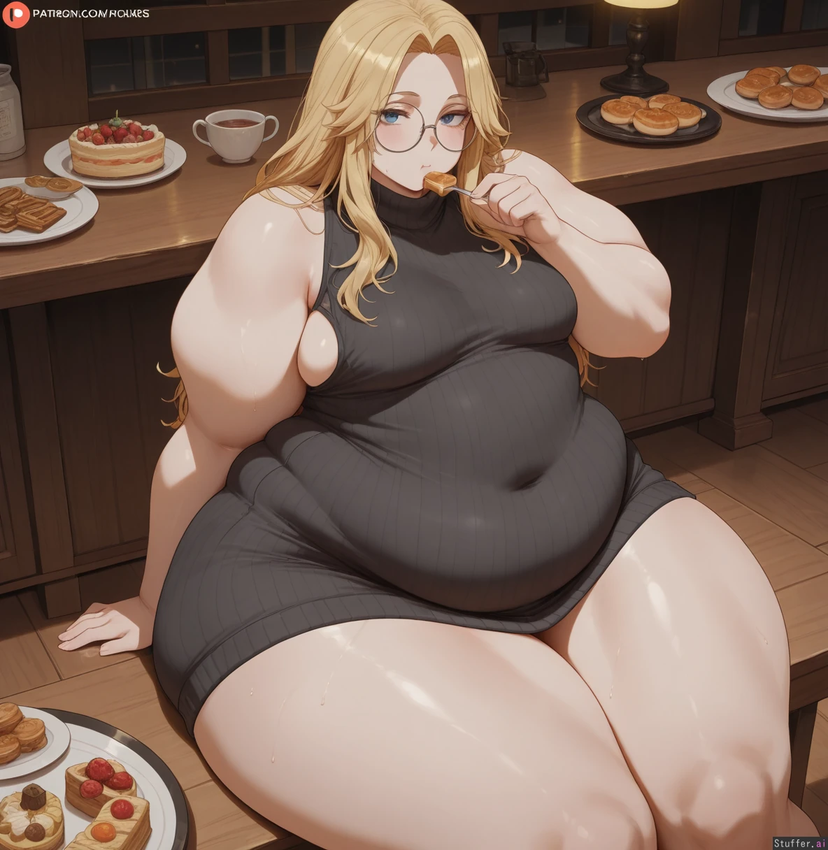 best quality), (high rating), absurd res, high res, detailed, ultra quality, (high quality), masterpiece, stunning beauty, (((detailed face))), intricate detail, beautiful face, exquisite detail, absurd resolution, correct anatomy, 8k, high definition picture, (highly detailed face), highly detailed skin texture, detailed background, (((perfect human anatomy))), ((perfect proportions)), better-with-salt(artist), c.cu(artist), shexyo(artist), mdf_an(artist), araneesama(artist), cutesexyrobutts(artist), w-oo-t(artist), assthethick(artist), butty-butter(artist), **Character:** 1girl. Solo. **Body Appearance:** Small breasts, ((wide hips:2)), bottom heavy, love handles, ((chubby belly:1.0)), ((obese:1.2)), ((bulky limbs)), ((thick thighs:2)), ((fat arms:1.5)), ((obese legs:2)), ((pale skin)), ((round chubby face:1.4))), (enormous ass:1.9), (extreme ass:1.9) **Eye:** blue eyes. **Emotions:** blush, horny, sweaty, ((embarrassed)) *Hair/Styles:** long hair, blonde, messy, **Clothes:** skin tight dress, (((fully clothed))), (((sweater dress))), ((((belly covered)))), round glasses, ((body covered)), jewelry **Setting:** Table, ((night)), cake, pastries, icecream, **Actions:** (sitting), sexual pose, looking at viewer, eating, **Perspective::** ((From above)), ((from side)), close to viewer,