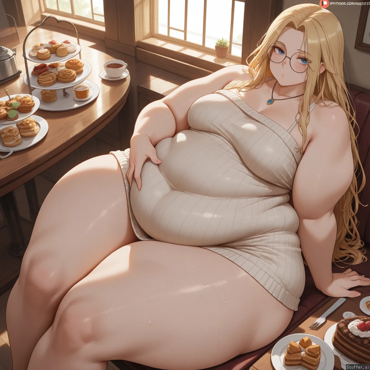 best quality), (high rating), absurd res, high res, detailed, ultra quality, (high quality), masterpiece, stunning beauty, (((detailed face))), intricate detail, beautiful face, exquisite detail, absurd resolution, correct anatomy, 8k, high definition picture, (highly detailed face), highly detailed skin texture, detailed background, (((perfect human anatomy))), ((perfect proportions)), better-with-salt(artist), c.cu(artist), shexyo(artist), mdf_an(artist), araneesama(artist), cutesexyrobutts(artist), w-oo-t(artist), assthethick(artist), butty-butter(artist), **Character:** 1girl. Solo. **Body Appearance:** Small breasts, ((wide hips:2)), bottom heavy, love handles, ((chubby belly:1.5)), ((obese:2.1)), ((bulky limbs)), ((thick thighs:2)), ((fat arms:1.5)), ((obese legs:2.1)), ((pale skin)), ((round chubby face:1.4))), ((enormous ass:1.5)), ((extreme ass:1.5)) **Eye:** blue eyes. **Emotions:** blush, horny, sweaty, ((embarrassed)) *Hair/Styles:** long hair, blonde, messy, **Clothes:** skin tight dress, (((fully clothed))), (((sweater dress))), ((((belly covered)))), round glasses, ((body covered)), jewelry **Setting:** Table, ((night)), cake, pastries, icecream, **Actions:** (sitting), sexual pose, looking at viewer, rubbing belly, **Perspective::** ((From above)), ((from side)), close to viewer,
