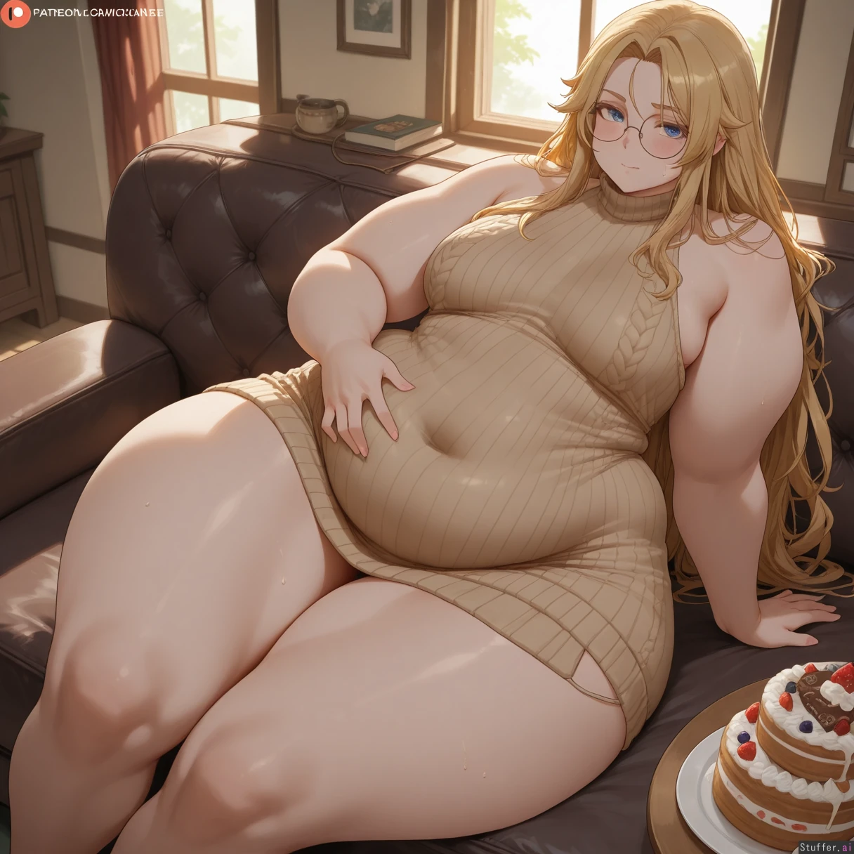 best quality), (high rating), absurd res, high res, detailed, ultra quality, (high quality), masterpiece, stunning beauty, (((detailed face))), intricate detail, beautiful face, exquisite detail, absurd resolution, correct anatomy, 8k, high definition picture, (highly detailed face), highly detailed skin texture, detailed background, (((perfect human anatomy))), ((perfect proportions)), better-with-salt(artist), c.cu(artist), shexyo(artist), mdf_an(artist), araneesama(artist), cutesexyrobutts(artist), w-oo-t(artist), assthethick(artist), butty-butter(artist), **Character:** 1girl. Solo. **Body Appearance:** Small breasts, ((wide hips:2)), bottom heavy, love handles, ((chubby belly:1.3)), ((obese:1.2)), ((bulky limbs)), ((thick thighs:2)), ((fat arms:1.5)), ((obese legs:1.6)), ((pale skin)), ((round chubby face:1.6))), ((enormous ass:1.5)), ((extreme ass:1.5)) **Eye:** blue eyes. **Emotions:** blush, horny, sweaty, ((embarrassed)) *Hair/Styles:** long hair, blonde, messy, **Clothes:** skin tight dress, (((fully clothed))), (((sweater dress))), ((((belly covered)))), round glasses, ((body covered)), jewelry **Setting:** Table, ((night)), cake, pastries, icecream, **Actions:** (sitting), sexual pose, looking at viewer, rubbing belly, **Perspective::** ((From above)), ((from side)), close to viewer,