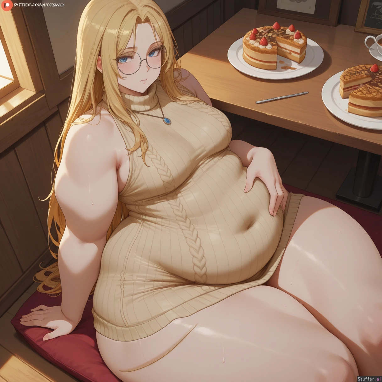 best quality), (high rating), absurd res, high res, detailed, ultra quality, (high quality), masterpiece, stunning beauty, (((detailed face))), intricate detail, beautiful face, exquisite detail, absurd resolution, correct anatomy, 8k, high definition picture, (highly detailed face), highly detailed skin texture, detailed background, (((perfect human anatomy))), ((perfect proportions)), better-with-salt(artist), c.cu(artist), shexyo(artist), mdf_an(artist), araneesama(artist), cutesexyrobutts(artist), w-oo-t(artist), assthethick(artist), butty-butter(artist), **Character:** 1girl. Solo. **Body Appearance:** Small breasts, ((wide hips:2)), bottom heavy, love handles, ((chubby belly:1.5)), ((obese:1.5)), ((bulky limbs)), ((thick thighs:2)), ((fat arms:1.5)), ((obese legs:1.6)), ((pale skin)), ((round chubby face:1.6))), ((enormous ass:1.5)), ((extreme ass:1.5)) **Eye:** blue eyes. **Emotions:** blush, horny, sweaty, ((embarrassed)) *Hair/Styles:** long hair, blonde, messy, **Clothes:** skin tight dress, (((fully clothed))), (((sweater dress))), ((((belly covered)))), round glasses, ((body covered)), jewelry **Setting:** Table, ((night)), cake, pastries, icecream, **Actions:** (sitting), sexual pose, looking at viewer, rubbing belly, **Perspective::** ((From above)), ((from side)), close to viewer,