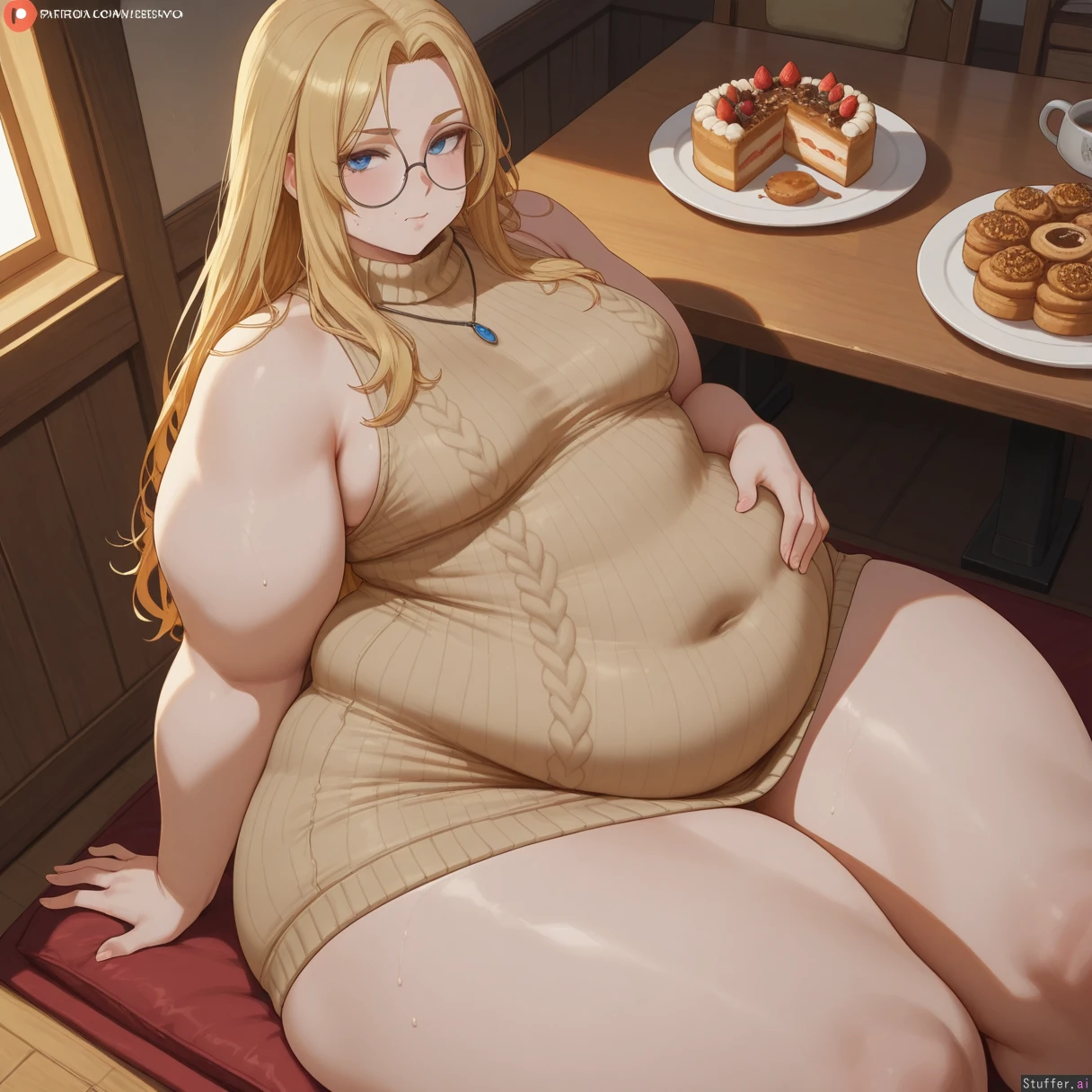best quality), (high rating), absurd res, high res, detailed, ultra quality, (high quality), masterpiece, stunning beauty, (((detailed face))), intricate detail, beautiful face, exquisite detail, absurd resolution, correct anatomy, 8k, high definition picture, (highly detailed face), highly detailed skin texture, detailed background, (((perfect human anatomy))), ((perfect proportions)), better-with-salt(artist), c.cu(artist), shexyo(artist), mdf_an(artist), araneesama(artist), cutesexyrobutts(artist), w-oo-t(artist), assthethick(artist), butty-butter(artist), **Character:** 1girl. Solo. **Body Appearance:** Small breasts, ((wide hips:2)), bottom heavy, love handles, ((chubby belly:1.5)), ((obese:1.9)), ((bulky limbs)), ((thick thighs:2)), ((fat arms:1.5)), ((obese legs:1.6)), ((pale skin)), ((round chubby face:1.6))), ((enormous ass:1.5)), ((extreme ass:1.5)) **Eye:** blue eyes. **Emotions:** blush, horny, sweaty, ((embarrassed)) *Hair/Styles:** long hair, blonde, messy, **Clothes:** skin tight dress, (((fully clothed))), (((sweater dress))), ((((belly covered)))), round glasses, ((body covered)), jewelry **Setting:** Table, ((night)), cake, pastries, icecream, **Actions:** (sitting), sexual pose, looking at viewer, rubbing belly, **Perspective::** ((From above)), ((from side)), close to viewer,