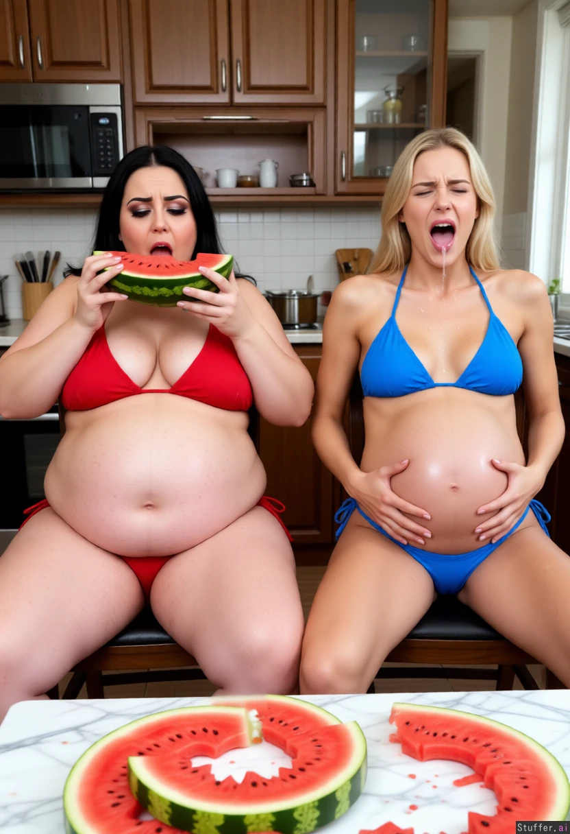 Front view Background: kitchen On the left: obese girl, black hair, beautiful face, heavy makeup, fat body, (((huge round belly))), wearing red bikini. Sitting on a chair. Eating watermelon, arched back, On the right: (((skinny))) beautiful girl, blonde hair, light makeup, (((giant round pregnant belly))), wearing blue bikini. Sitting on a chair. Rubbing her belly with both hands, (((painful grimace))), (((puking))) In front: table with watermelon rinds