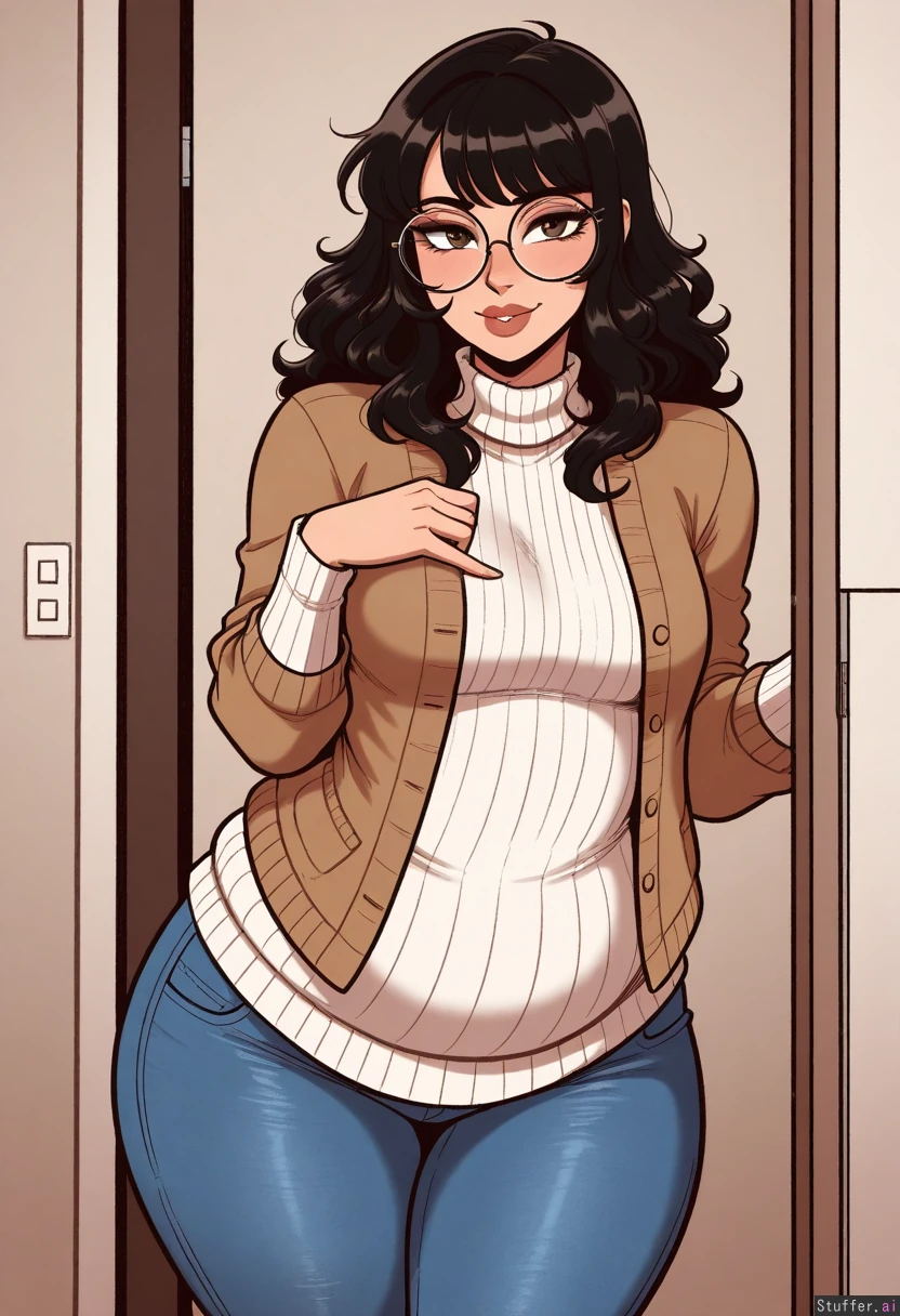 Solo, scruffyturtles(artist), perfect proportions, supermodel face, sexy, ((realistic, detailed)), (((latina))), ((light tan skin)) Long black hair, wavy hair, brown eyes, black eye liner, (bangs), (white sweater), (round glasses), (brown open sweater jacket), (jeans), (((((fully clothed))))) ((Obese body)), (small breasts), (skinny hips)), ((skinny thighs)) (In an apartment), standing, (flirty smile), (nervous smile), sexy pose, big lips