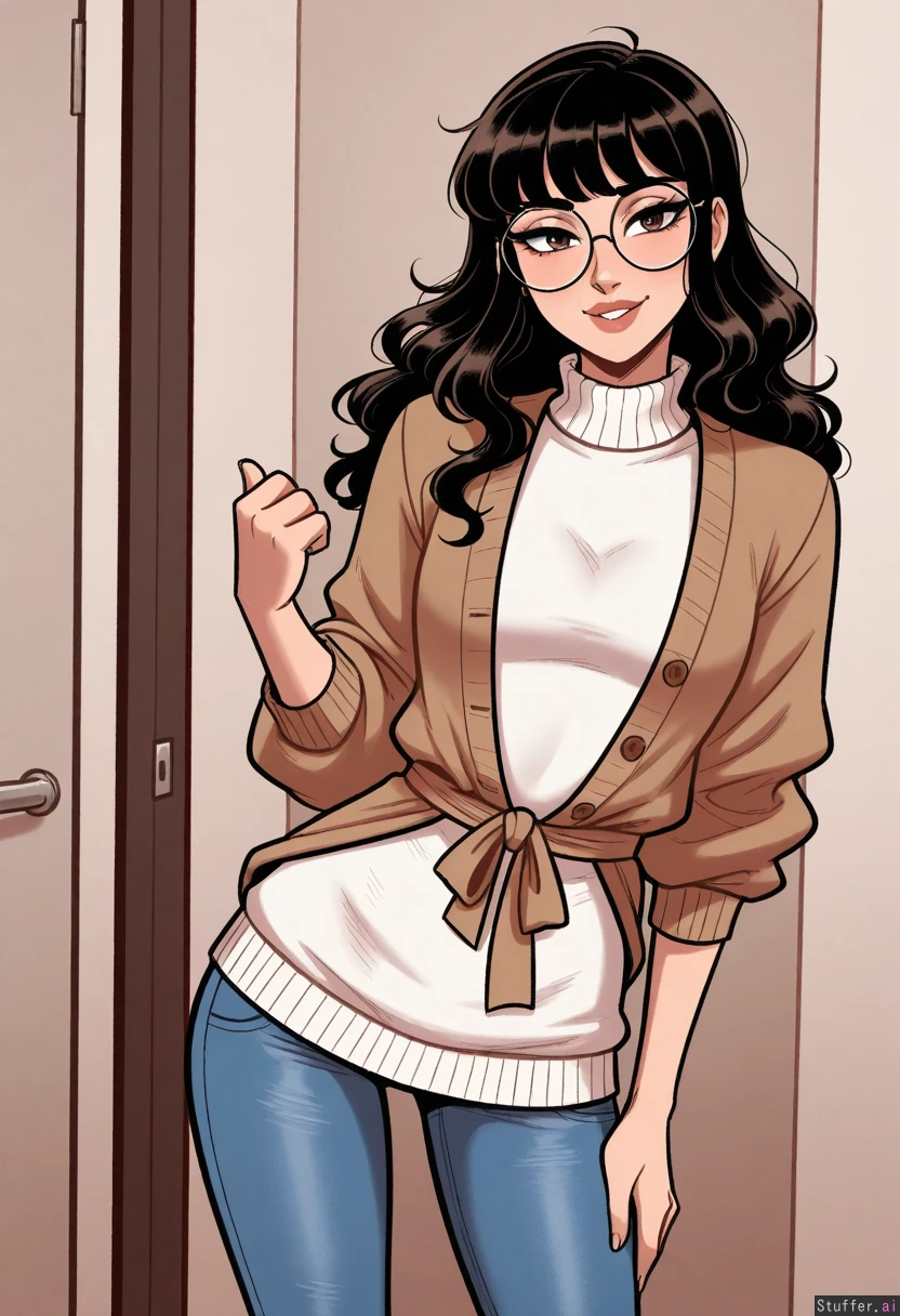 Solo, scruffyturtles(artist), perfect proportions, supermodel face, sexy, ((realistic, detailed)), (((latina))), ((light tan skin)) Long black hair, wavy hair, brown eyes, black eye liner, (bangs), (white sweater), (round glasses), (brown open sweater jacket), (jeans), (((((fully clothed))))) ((Skinny body)), (small breasts), (skinny hips)), ((skinny thighs)) (In an apartment), standing, (flirty smile), (nervous smile), sexy pose, big lips