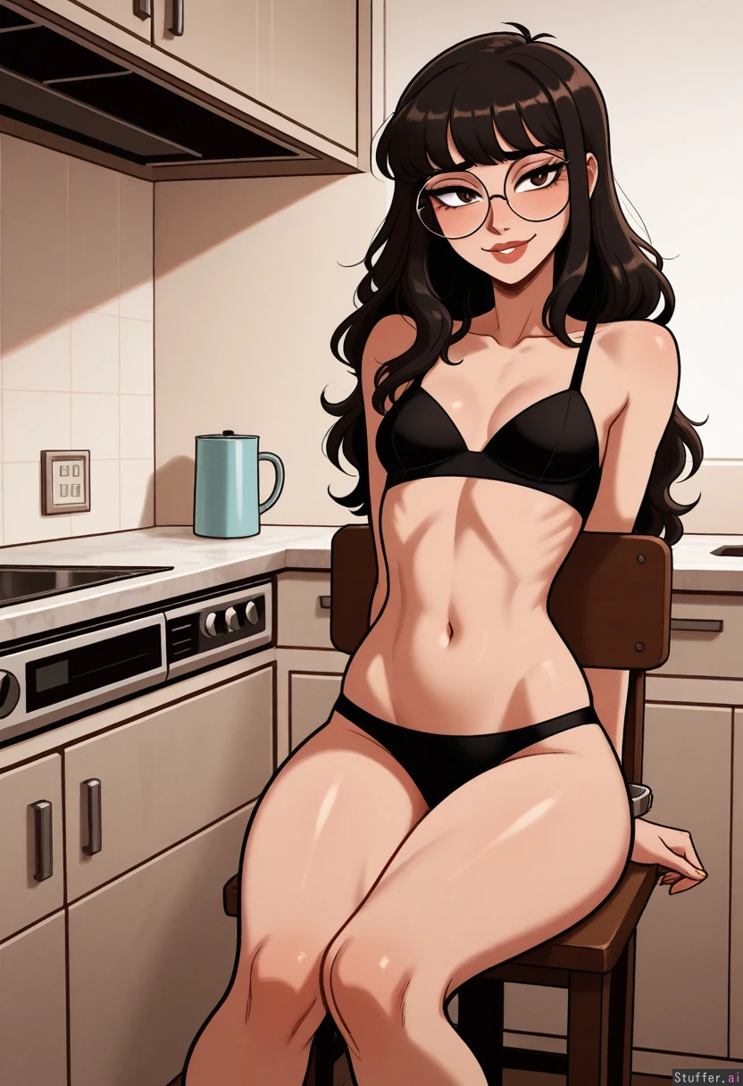 Solo, scruffyturtles(artist), perfect proportions, supermodel face, sexy, ((realistic, detailed)), (((latina))), (light brown skin) Long black hair, wavy hair, brown eyes, black eye liner, (bangs), (tooless), (black panties), (round glasses) ((Skimny body)), (small breasts), ((skinny hips)), ((skinny thighs)) (In an apartment kitchen), sitting, (flirty smile), (nervous smile), sexy pose, big lips, arms behind back, handcuffed to chair