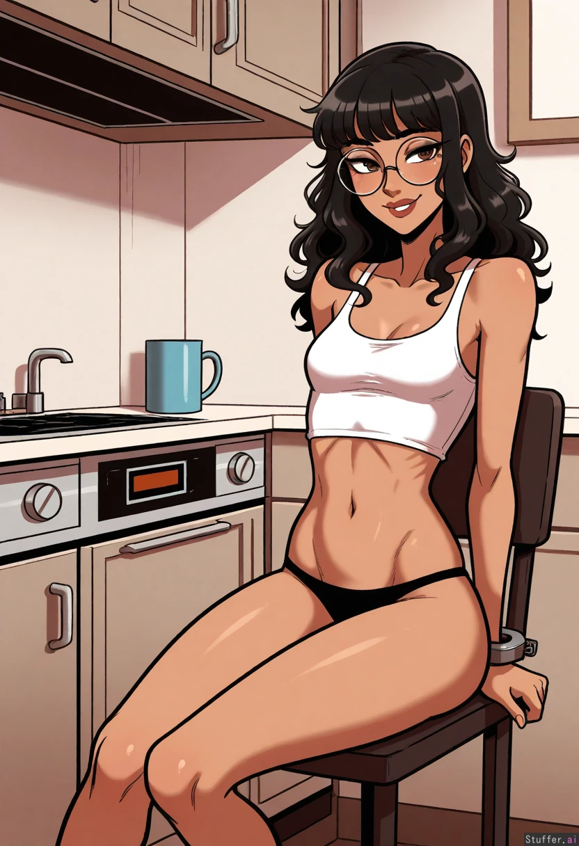 Solo, scruffyturtles(artist), perfect proportions, supermodel face, sexy, ((realistic, detailed)), (((latina))), (light brown skin) Long black hair, wavy hair, brown eyes, black eye liner, (bangs), (white crop top tank top), (black panties), (round glasses) ((Skimny body)), (small breasts), ((skinny hips)), ((skinny thighs)) (In an apartment kitchen), sitting, (flirty smile), (nervous smile), sexy pose, big lips, arms behind back, handcuffed to chair