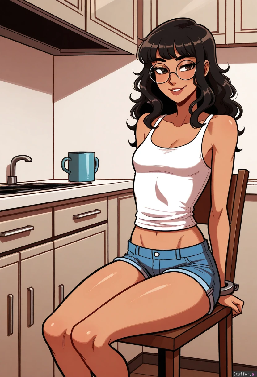 Solo, scruffyturtles(artist), perfect proportions, supermodel face, sexy, ((realistic, detailed)), (((latina))), (light brown skin) Long black hair, wavy hair, brown eyes, black eye liner, (bangs), (white tank top), (jean shorts), (round glasses) ((Skinny body)), (small breasts), ((skinny hips)), ((skinny thighs)), (In an apartment kitchen), sitting, (flirty smile), (nervous smile), sexy pose, big lips, arms behind back, handcuffed to wooden chair