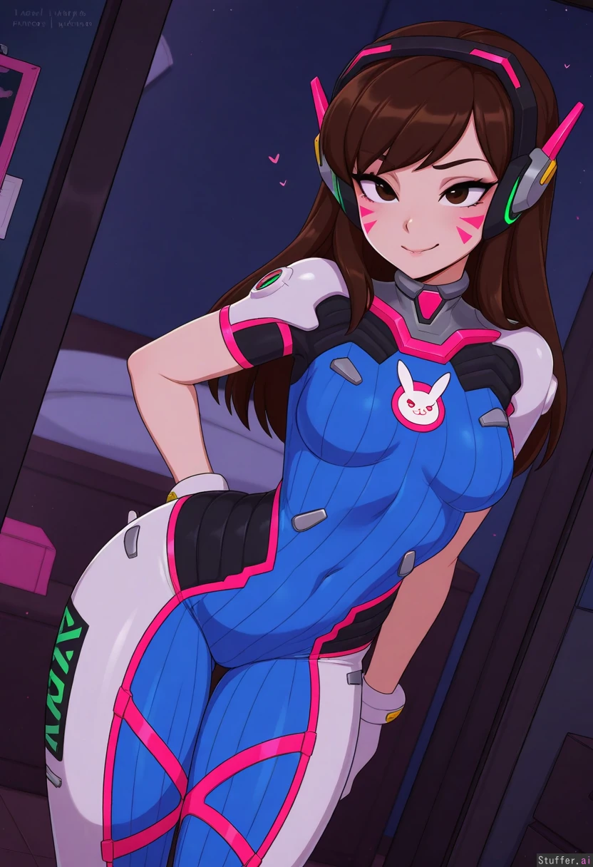masterpiece,best quality,amazing quality, (d.va_(overwatch))), ((eyeliner)), choker, (((side angle))), Lewdlemage, merunyaa, standing, dark bedroom,