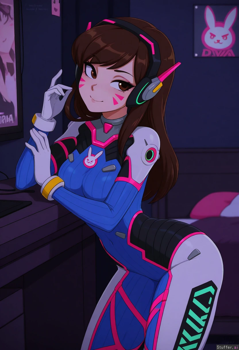 masterpiece,best quality,amazing quality, (d.va_(overwatch))), ((eyeliner)), choker, (side view:1.2), Lewdlemage, merunyaa, standing, dark bedroom,