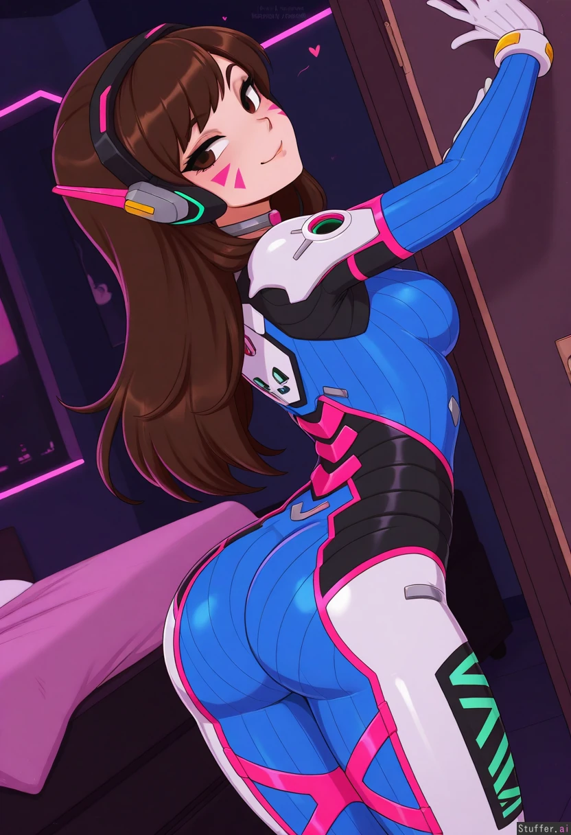 masterpiece,best quality,amazing quality, (d.va_(overwatch))), ((eyeliner)), choker, (side view:1.2), Lewdlemage, merunyaa, standing, dark bedroom, arched back, (fat ass:1.4), covered ass,