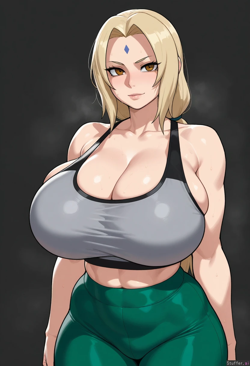 (( solo, 1girl, krekkov (artist) )) (( tsunade_(naruto) )) (( Grey_top, cropped_top, tank_top, dark_green_yoga_pants)) (( gigantic_breasts:0.9)) (( thin_waist, thick_arms))