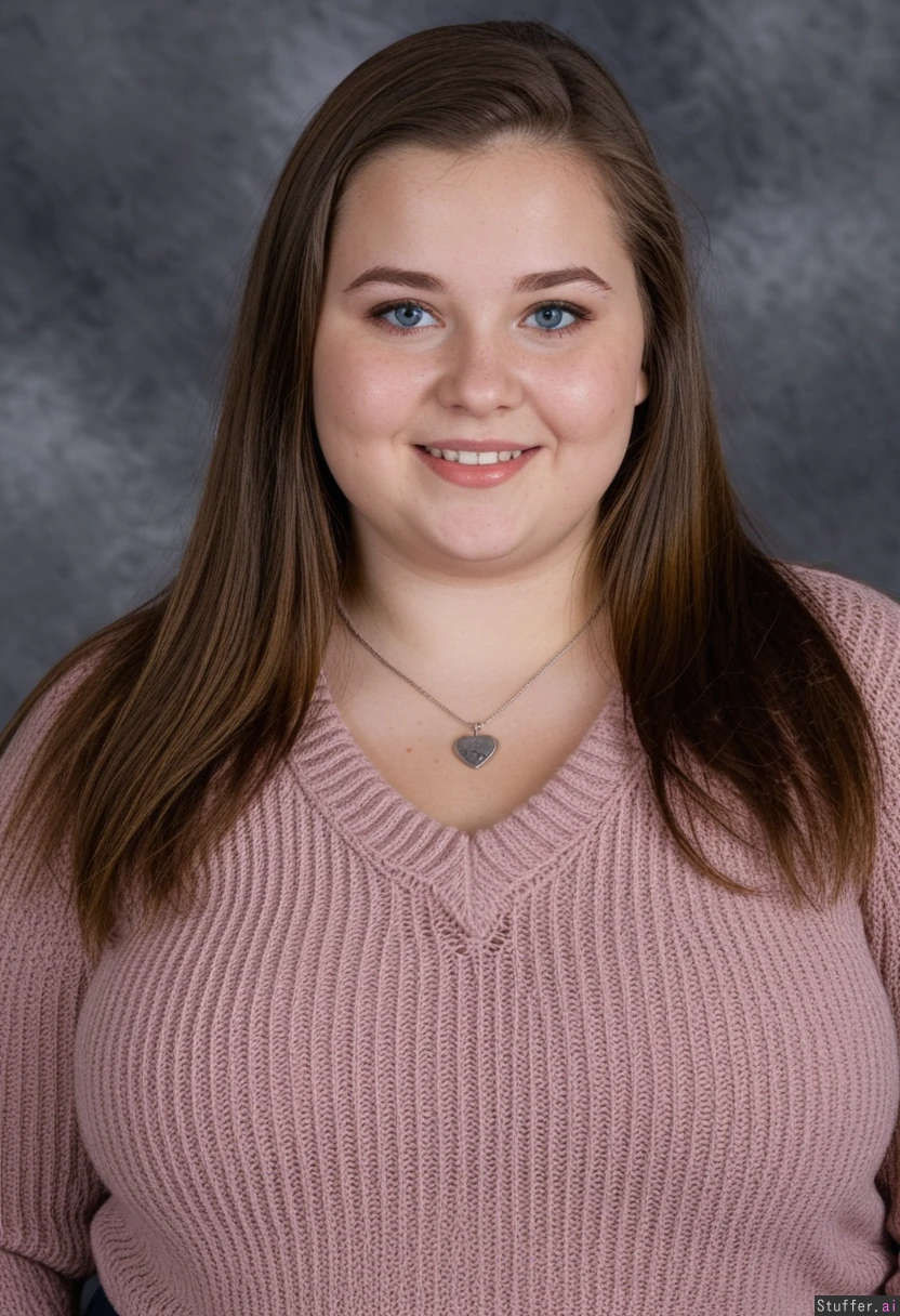 (highschool-aged) brunette, (10th-grader) blue-eyes, round-face, attractive, symmetrical-face, southern-european-look, american, model-like-face small-necklace, wholesome-smile curvy, fertile, (heavy-chest), busty, topheavy, overweight, (obese) wearing a well-filled sweater, taut fabric over her chest, barely-fitting posing-for-her-yearbook-photol, grey mottled backdrop (highschool-yearbook) 4k-masterpiece, best-quality, good-lighting, film-grain, bokeh, blurry-background, portrait