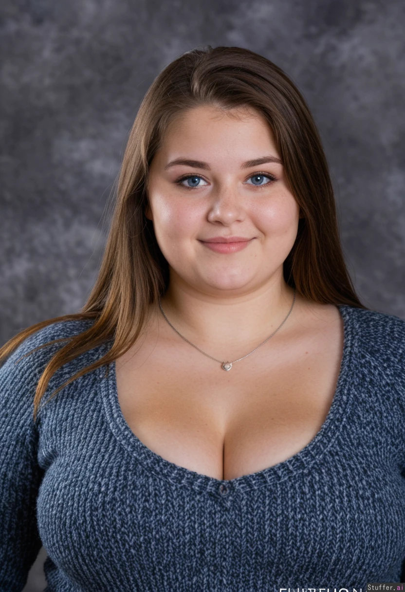 (highschool-aged) brunette, (10th-grader) blue-eyes, round-face, attractive, symmetrical-face, southern-european-look, american, model-like-face (double-chin), fat-face small-necklace, wholesome-smile curvy, fertile, (heavy-chest), busty, topheavy, overweight, (obese) wearing a well-filled sweater, taut fabric over her chest, barely-fitting posing-for-her-yearbook-photol, grey mottled backdrop (highschool-yearbook) three-quarter-view 4k-masterpiece, best-quality, good-lighting, film-grain, bokeh, blurry-background, portrait
