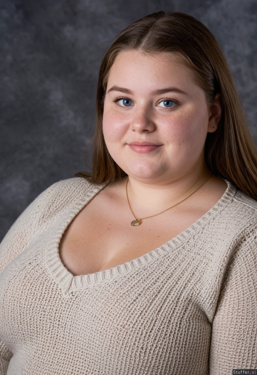 (highschool-aged) brunette, (10th-grader) blue-eyes, round-face, attractive, symmetrical-face, southern-european-look, american, model-like-face (double-chin), fat-face slight-blush, natural-look small-necklace, wholesome-smile curvy, fertile, (heavy-chest), busty, topheavy, overweight, (morbidly-obese) wearing a well-filled sweater, taut fabric over her chest, barely-fitting posing-for-her-yearbook-photol, grey mottled backdrop (highschool-yearbook) three-quarter-view 4k-masterpiece, best-quality, good-lighting, film-grain, bokeh, blurry-background, portrait