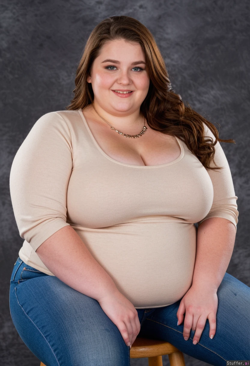 (highschool-aged) (19yo) brunette pretty-girl, blue-eyes, round-face, attractive, symmetrical-face, american, model-like-face wavy-brown-hair, well-kept-appearance (double-chin), fat-face, facial-fat, adipose slight-blush, natural-look small-necklace, wholesome-smile curvy, fertile, (heavy-chest:1.3), busty, topheavy, overweight, (morbidly-obese:1.3) wearing a well-filled plus-size beige sweater, taut fabric over her swollen chest, barely-fitting plus-size jeans posing-for-her-yearbook-photol, grey mottled backdrop (highschool-yearbook) sitting-on-a-wooden-stool, 4k-masterpiece, best-quality, good-lighting, film-grain, bokeh, blurry-background,