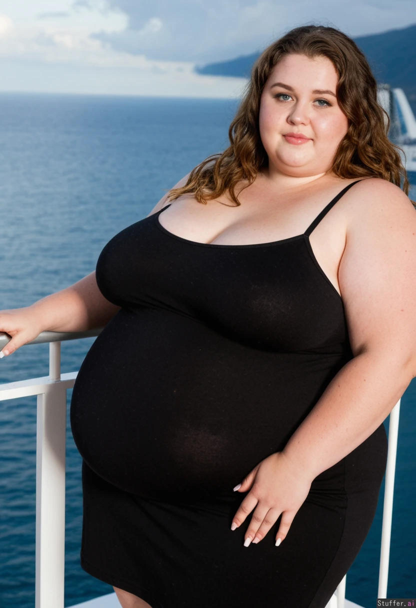 (highschool-aged) (19yo) brunette pretty-girl, blue-eyes, large-eyes, round-face, attractive, symmetrical-face, american, model-like-face wavy-brown-hair, well-kept-appearance (double-chin), fat-face, facial-fat, adipose slight-blush, natural-look curvy, fertile, (heavy-chest:1.6),,overweight, (morbidly-obese:1.5) wearing a black loose (plus-size) summer dress (fully-dressed) standing on the deck of a cruise ship, posing, on-a-ship vacation-snapshot, tourist, 4k-masterpiece, best-quality, good-lighting, film-grain, bokeh, blurry-background,