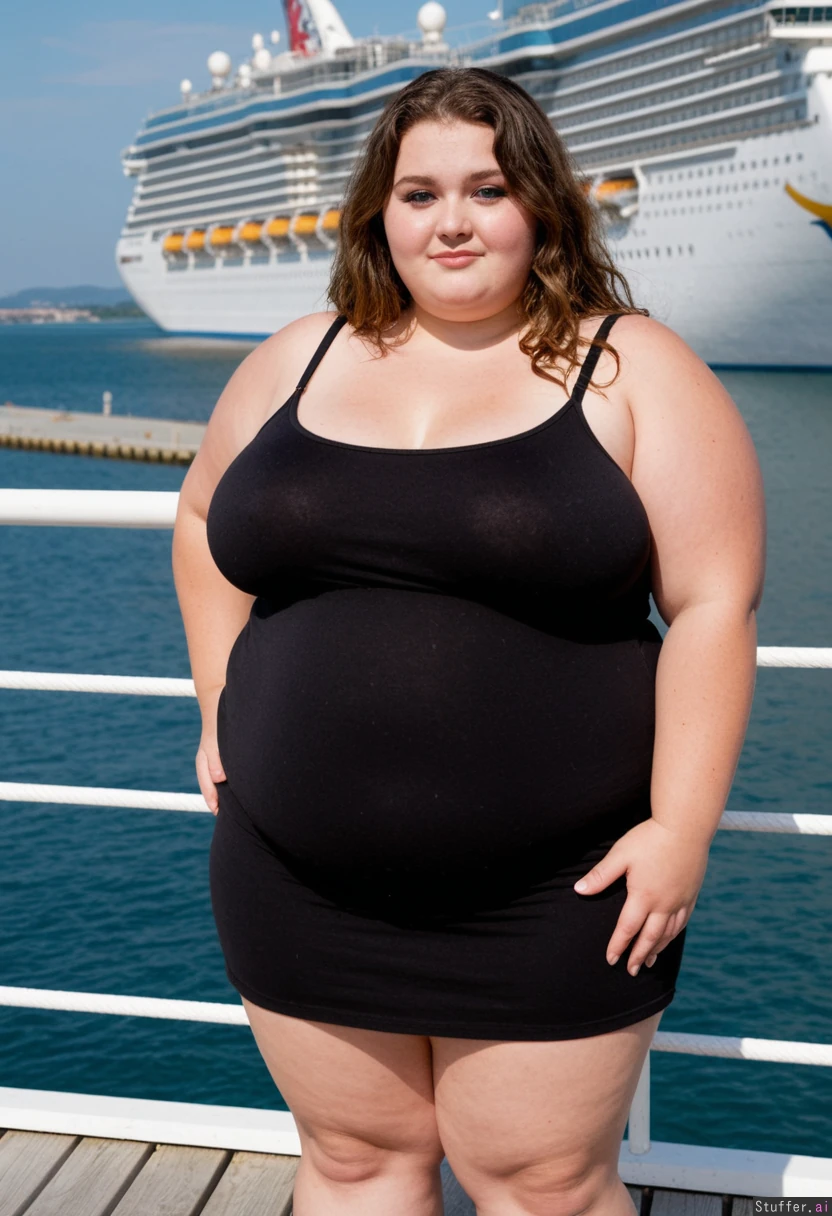 (highschool-aged) (19yo) brunette pretty-girl, blue-eyes, large-eyes, round-face, attractive, symmetrical-face, american, model-like-face wavy-brown-hair, well-kept-appearance (double-chin), fat-face, facial-fat, adipose slight-blush, natural-look curvy, fertile, (heavy-chest:1.6),,overweight, (morbidly-obese:1.5) wearing a black loose (plus-size) summer dress (fully-dressed) standing on the dock, next-to-a-massive-cruise-ship vacation-snapshot, tourist, 4k-masterpiece, best-quality, good-lighting, film-grain, bokeh, blurry-background,
