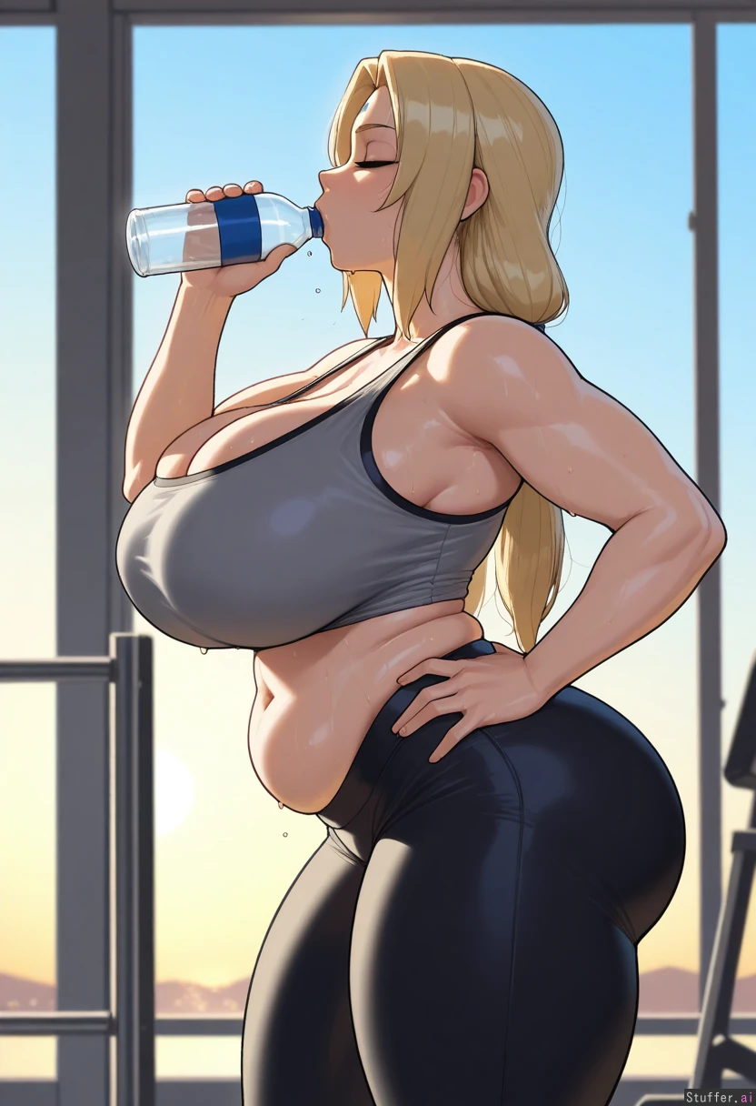 (( solo, 1girl, krekkov (artist) )) (( tsunade_(naruto) )) (( Grey_top, cropped_top, tank_top, black_yoga_pants)) (( gigantic_breasts:0.9)) (( fat_ass:1.1)) (( thick_thighs:1.0)) (( thin_waist, thick_arms)) (( bloated_belly:1.1)) (( Gym, Dawn, sunlight, sweaty_body, standing, hand_on_hip, closed_eyes, holding_water_bottle, side_profile, drinking, bottle_in_mouth))