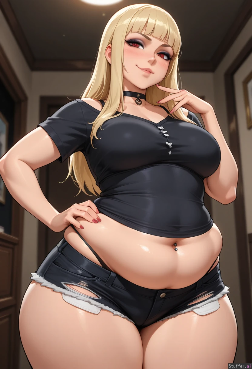 (Solo), stunning beauty, gorgeous, ((eyeliner)), long blonde hair, blunt bangs, scarlet eyes, (blushing), choker, medium breasts, ((thicker thighs)), ((adult)), thong showing, (navel piercing), ((goth)) krekkov(artist), reiq(artist), kittew(artist), ripped shorts (((chubby tummy, bottom heavy, wide hips, weight gain))), (((midriff peek))), (tall, smug)