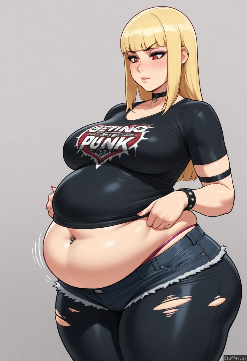 (Solo), stunning beauty, gorgeous, ((eyeliner)), long blonde hair, blunt bangs, scarlet eyes, (blushing), choker, medium breasts, ((thicker thighs)), ((adult)), thong showing, (navel piercing), ((punk)) krekkov(artist), reiq(artist), ripped shorts (((chubby tummy, bottom heavy, wide hips, weight gain, getting too fat))), (((midriff peek))), (tall)