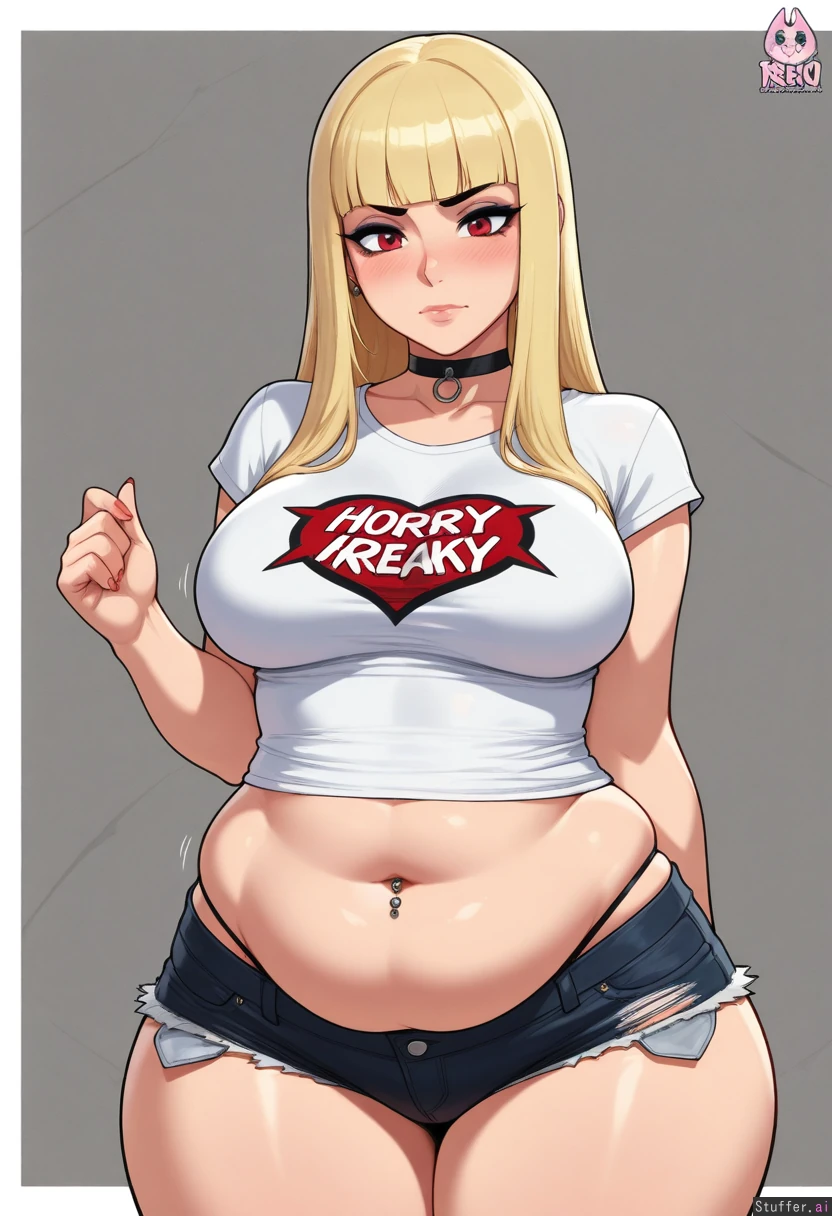 (Solo), stunning beauty, gorgeous, ((eyeliner)), long blonde hair, blunt bangs, scarlet eyes, (blushing), choker, medium breasts, ((thicker thighs)), ((adult)), thong showing, (navel piercing), ((punk)) krekkov(artist), reiq(artist), ripped shorts ((chubby tummy, bottom heavy, wide hips, weight gain)), (((midriff peek))), (tall, horny), loose shirt