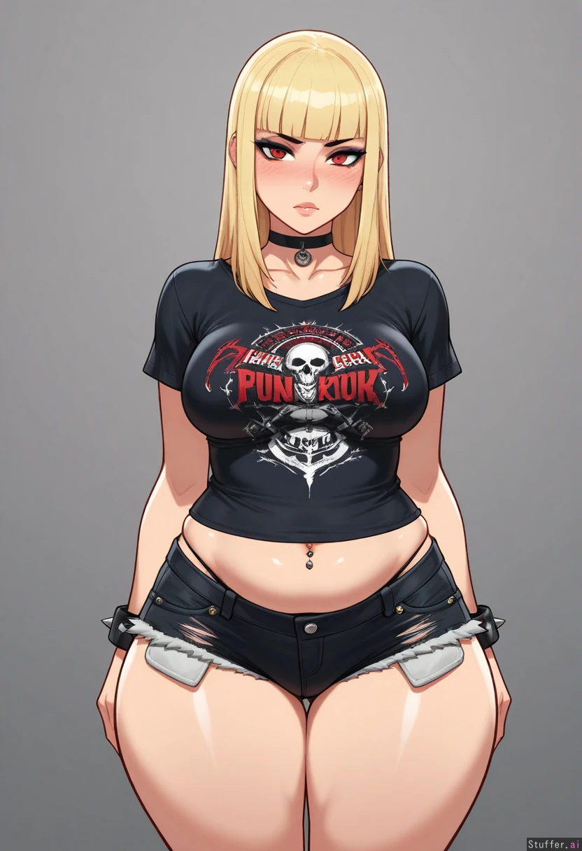 (Solo), stunning beauty, gorgeous, ((eyeliner)), long blonde hair, blunt bangs, scarlet eyes, (blushing), choker, medium breasts, ((thicker thighs)), ((adult)), thong showing, (navel piercing), ((punk)) krekkov(artist), reiq(artist), ripped shorts ((chubby tummy, bottom heavy, wide hips)), (((midriff peek))), (tall, horny), loose shirt