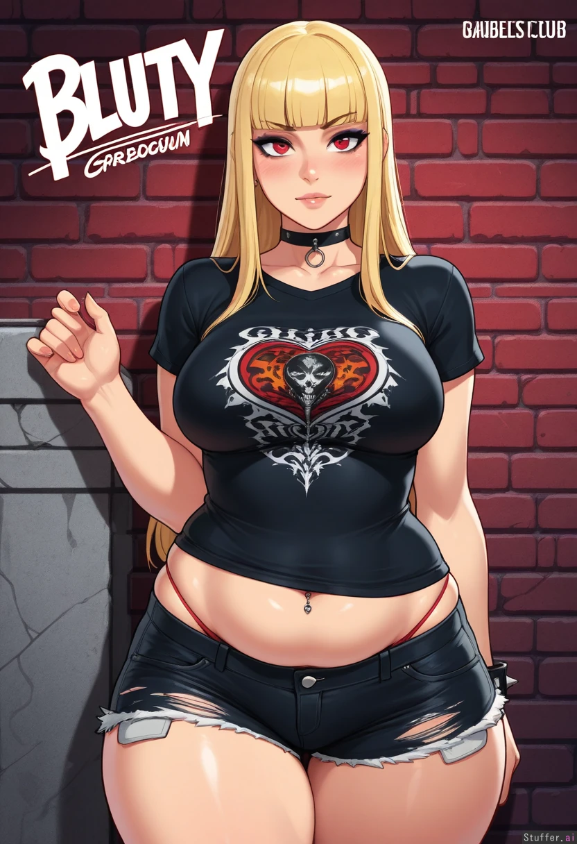 (Solo), stunning beauty, gorgeous, ((eyeliner)), long blonde hair, blunt bangs, scarlet eyes, (blushing), choker, medium breasts, ((thicker thighs)), ((adult)), thong showing, (navel piercing), ((punk)) krekkov(artist), reiq(artist), ripped shorts ((chubby tummy, bottom heavy, wide hips)), (((midriff peek))), (slutty, horny)