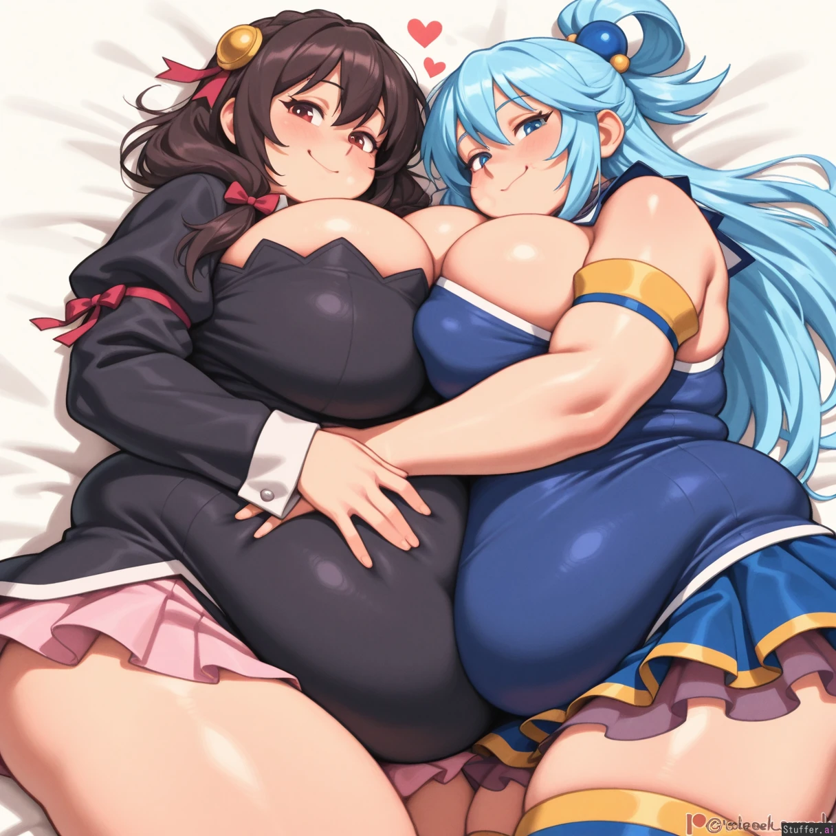 absurdres, 8k, perfect anatomy, masterpiece, beautiful face, beautiful eyes, noodlenood /(artist/) , (wamudraws /(artist/):1.0) 2 girls, couple, Lovebirds, Girl 1: (YunYun), black dress, huge breasts, bursting breasts, (inflated breasts: 1.4), bbw, ssbbw, fat arms, fat legs, round face, (fat cheeks:1.2), fat fingers, fat hands, (obese: 1.9), (huge belly: 1.0), lying on bed Girl 2: blue dress, ((Aqua from Konosuba)), slim, hugging ((plain white background)), Mutual love, love each other, happy,