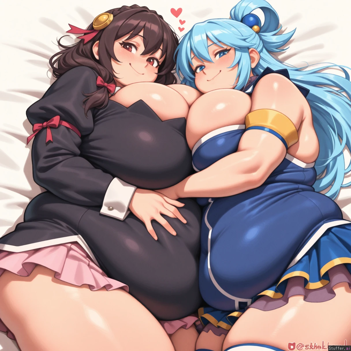 absurdres, 8k, perfect anatomy, masterpiece, beautiful face, beautiful eyes, noodlenood /(artist/) , (wamudraws /(artist/):1.0) 2 girls, couple, Lovebirds, Girl 1: (YunYun), black dress, gigantic breasts, bursting breasts, (inflated breasts: 1.4), bbw, ssbbw, fat arms, fat legs, round face, (fat cheeks:1.2), fat fingers, fat hands, (obese: 1.9), (huge belly: 1.0), lying on bed Girl 2: blue dress, ((Aqua from Konosuba)), slim, hugging ((plain white background)), Mutual love, love each other, happy,