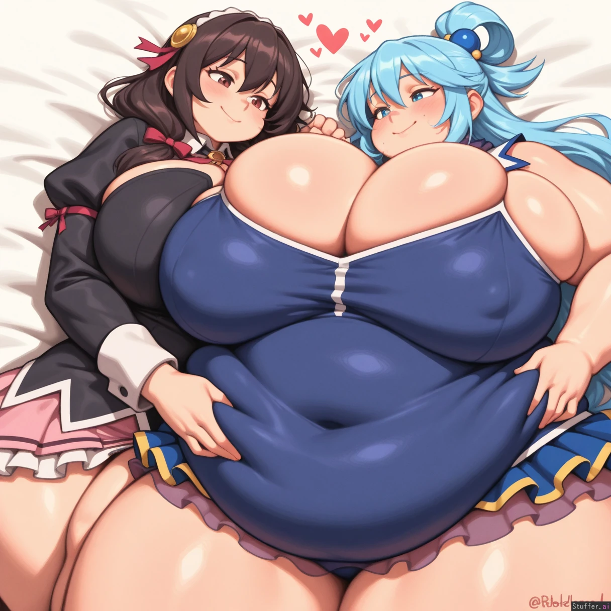 absurdres, 8k, perfect anatomy, masterpiece, beautiful face, beautiful eyes, noodlenood /(artist/) , (wamudraws /(artist/):1.0) 2 girls, couple, Lovebirds, Girl 1: (YunYun), black dress, gigantic breasts, bursting breasts, (inflated breasts: 1.4), bbw, ssbbw, fat arms, fat legs, round face, (fat cheeks:1.2), fat fingers, fat hands, (obese: 1.9), (huge belly: 1.0), lying on bed Girl 2: blue dress, ((Aqua from Konosuba)), slim, ((plain white background)), Mutual love, love each other, happy,