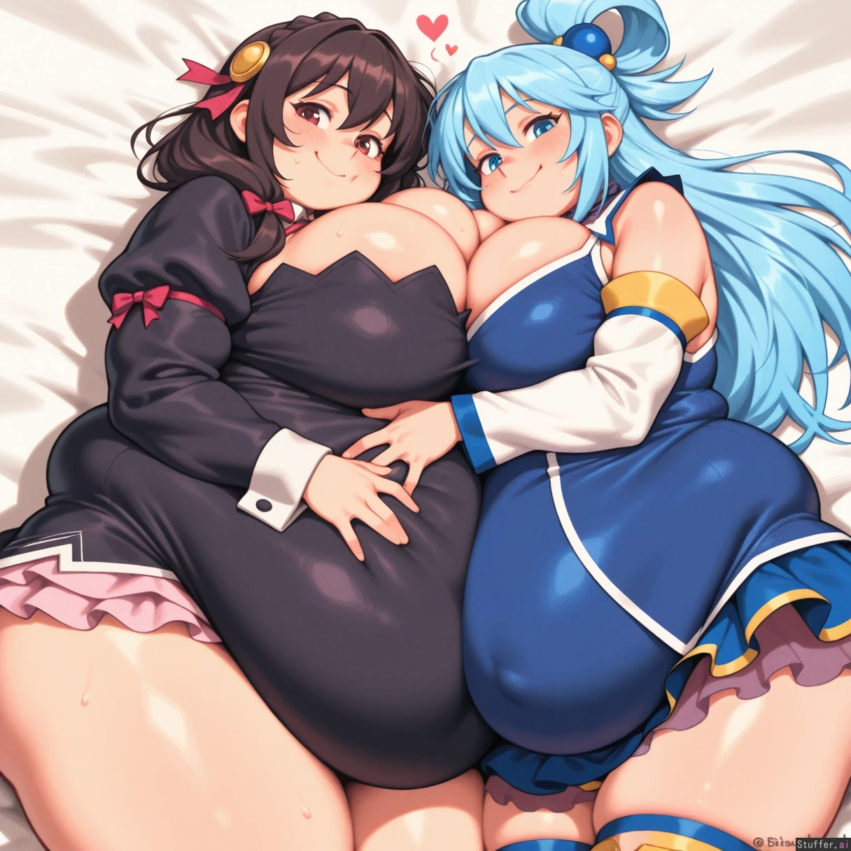 absurdres, 8k, perfect anatomy, masterpiece, beautiful face, beautiful eyes, noodlenood /(artist/) , (wamudraws /(artist/):1.0) 2 girls, couple, Lovebirds, Girl 1: (YunYun), black dress, gigantic breasts, bursting breasts, (inflated breasts: 1.0), bbw, ssbbw, fat arms, fat legs, round face, (fat cheeks:1.2), fat fingers, fat hands, (obese: 1.6), (huge belly: 1.4), lying on bed Girl 2: blue dress, ((Aqua from Konosuba)), slim, ((plain white background)), Mutual love, love each other, happy,