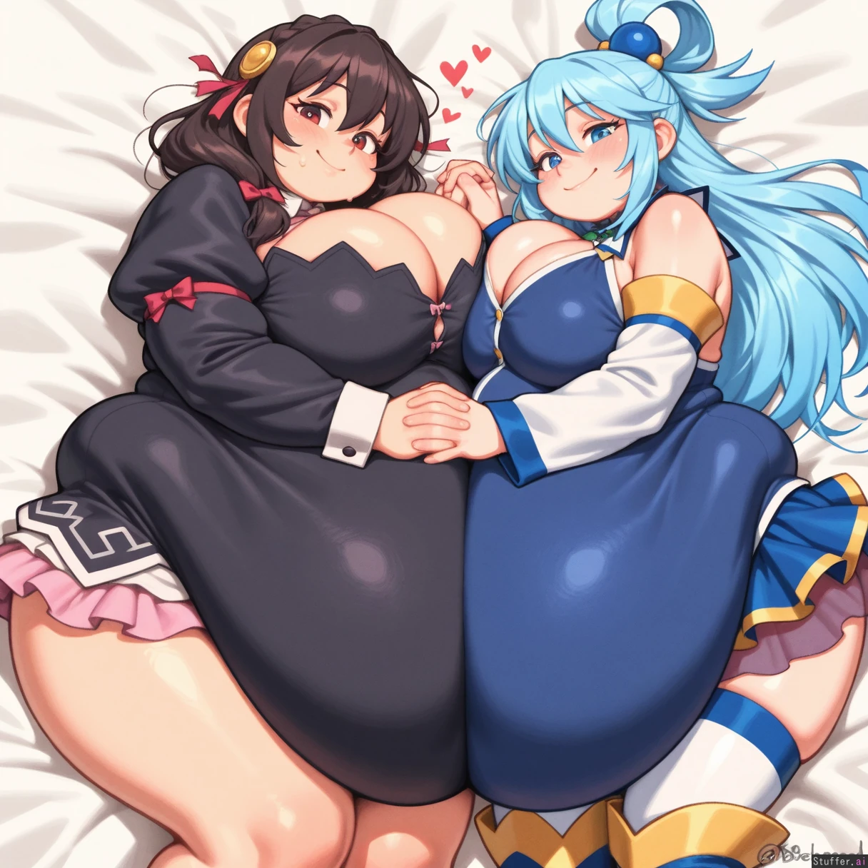 absurdres, 8k, perfect anatomy, masterpiece, beautiful face, beautiful eyes, noodlenood /(artist/) , (wamudraws /(artist/):1.0) 2 girls, couple, Lovebirds, Girl 1: (YunYun), black dress, gigantic breasts, bursting breasts, (inflated breasts: 1.0), bbw, ssbbw, fat arms, fat legs, round face, (fat cheeks:1.2), fat fingers, fat hands, (obese: 1.6), (huge belly: 1.6), lying on bed Girl 2: blue dress, ((Aqua from Konosuba)), slim, holding hand ((plain white background)), Mutual love, love each other, happy,