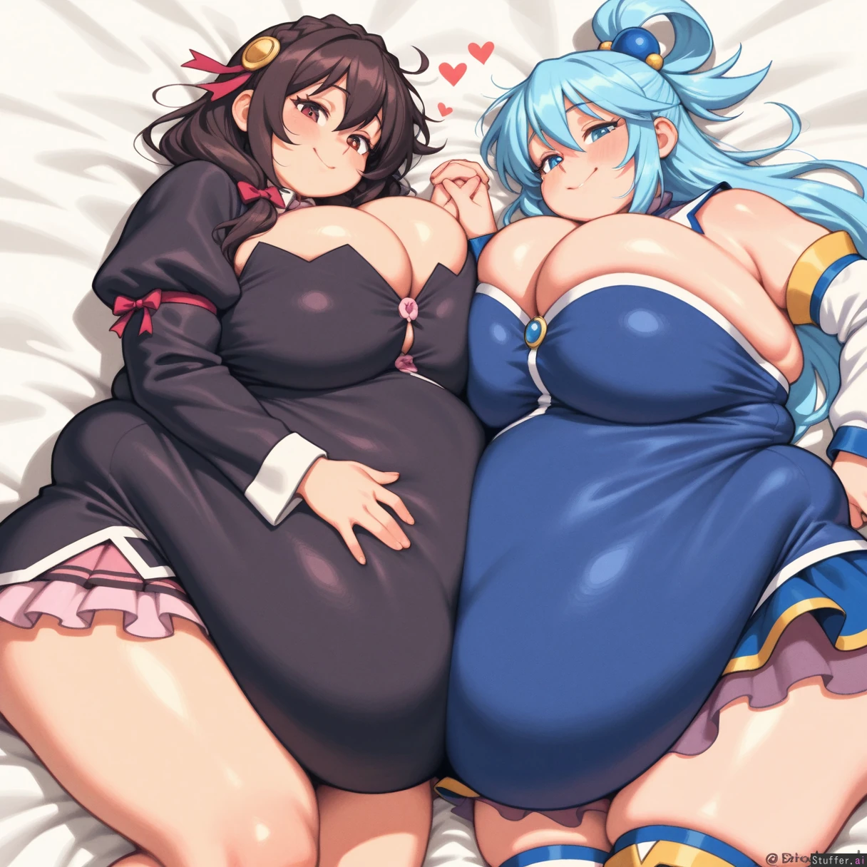 absurdres, 8k, perfect anatomy, masterpiece, beautiful face, beautiful eyes, noodlenood /(artist/) , (wamudraws /(artist/):1.0) 2 girls, couple, Lovebirds, Girl 1: (YunYun), black dress, gigantic breasts, bursting breasts, (inflated breasts: 1.3), bbw, ssbbw, fat arms, fat legs, round face, (fat cheeks:1.2), fat fingers, fat hands, (obese: 1.6), (huge belly: 1.6), lying on bed Girl 2: blue dress, ((Aqua from Konosuba)), slim, holding hand ((plain white background)), Mutual love, love each other, happy,