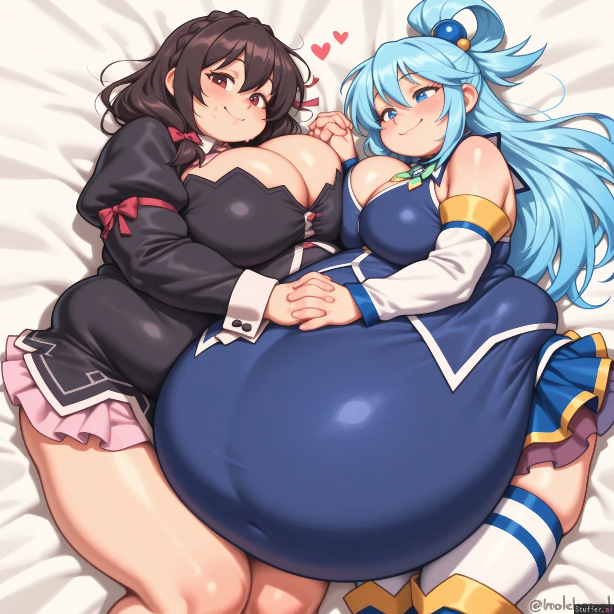 absurdres, 8k, perfect anatomy, masterpiece, beautiful face, beautiful eyes, noodlenood /(artist/) , (wamudraws /(artist/):1.0) 2 girls, couple, Lovebirds, Girl 1: (YunYun), black dress, gigantic breasts, bursting breasts, (inflated breasts: 1.0), bbw, ssbbw, fat arms, fat legs, round face, (fat cheeks:1.2), fat fingers, fat hands, (obese: 1.6), (huge belly: 1.7), lying on bed Girl 2: blue dress, ((Aqua from Konosuba)), slim, holding hand ((plain white background)), Mutual love, love each other, happy,