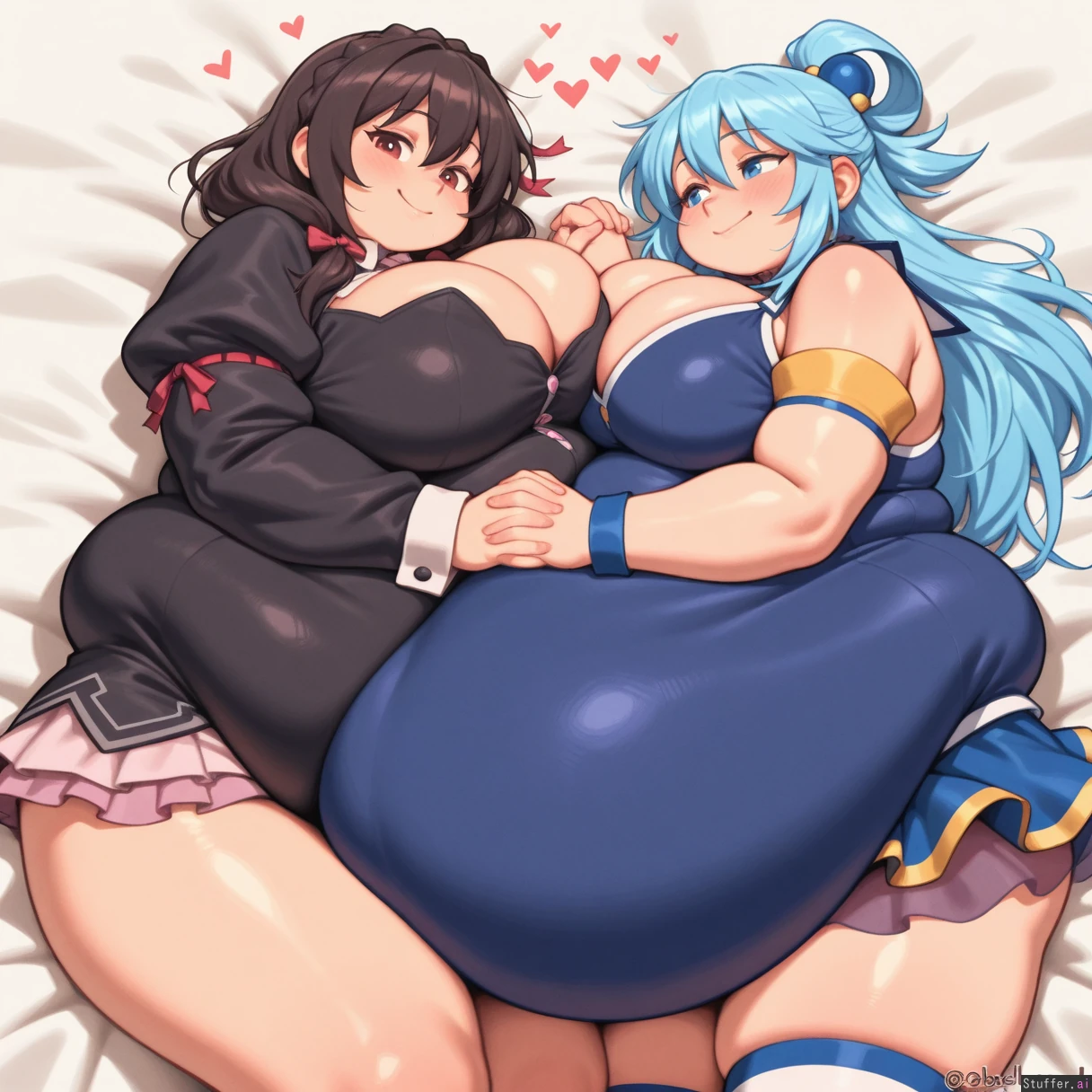 absurdres, 8k, perfect anatomy, masterpiece, beautiful face, beautiful eyes, noodlenood /(artist/) , (wamudraws /(artist/):1.0) 2 girls, couple, Lovebirds, Girl 1: (YunYun), black dress, gigantic breasts, bursting breasts, (inflated breasts: 1.0), bbw, ssbbw, fat arms, fat legs, round face, (fat cheeks:1.2), fat fingers, fat hands, (obese: 1.9), (huge belly: 1.6), lying on bed Girl 2: blue dress, ((Aqua from Konosuba)), slim, holding hand ((plain white background)), Mutual love, love each other, happy,