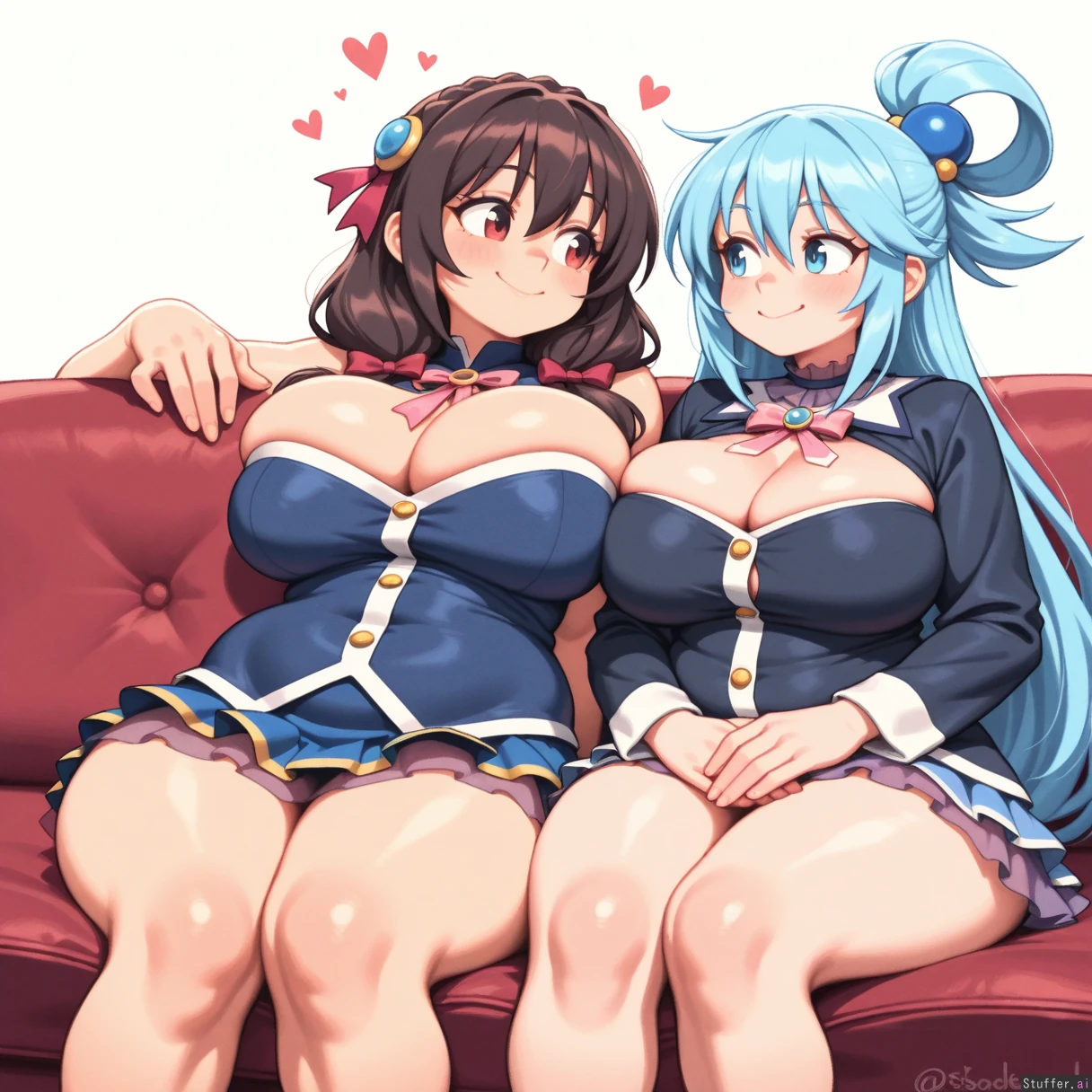 absurdres, 8k, perfect anatomy, masterpiece, beautiful face, beautiful eyes, noodlenood /(artist/) , (wamudraws /(artist/):1.0) 2 girls, couple, Lovebirds, Girl 1: (YunYun), black dress, big breasts, bursting breasts, (inflated breasts: 1.0), bbw, ssbbw, fat arms, fat legs, round face, fat cheeks, fat fingers, fat hands, (obese: 1.0), (bloated belly: 0.5), sitting on sofa Girl 2: blue dress, ((Aqua from Konosuba)), slim, hugging ((plain white background)), Mutual love, love each other, happy,