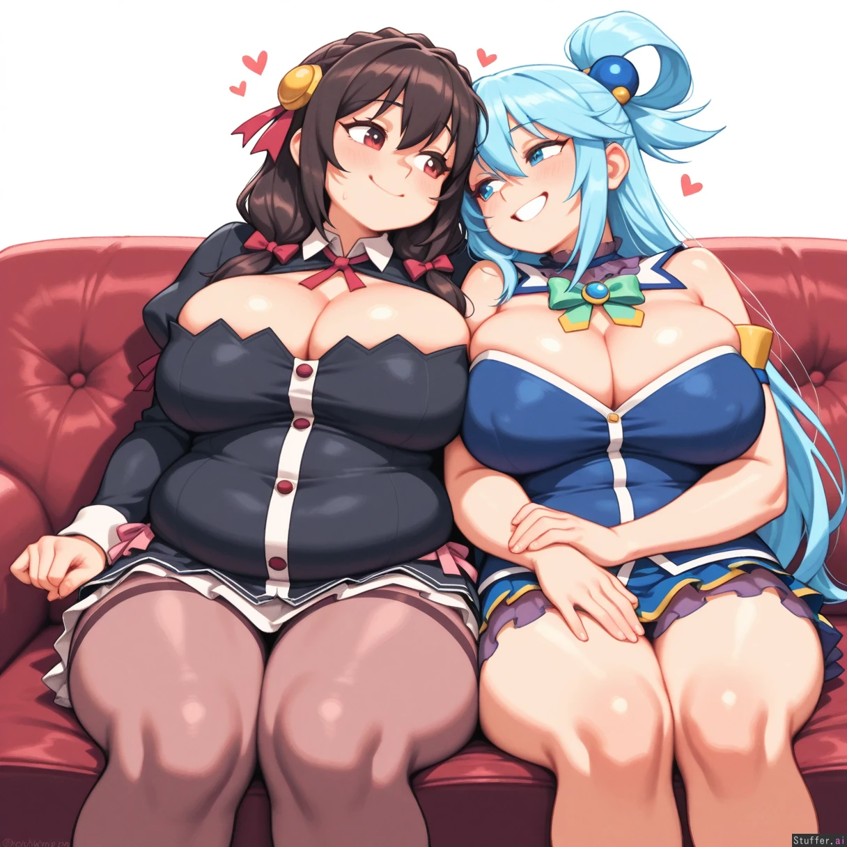 absurdres, 8k, perfect anatomy, masterpiece, beautiful face, beautiful eyes, noodlenood /(artist/) , (wamudraws /(artist/):1.0) 2 girls, couple, Lovebirds, Girl 1: (YunYun), black dress, big breasts, bursting breasts, (inflated breasts: 1.0), bbw, ssbbw, fat arms, fat legs, round face, fat cheeks, fat fingers, fat hands, (obese: 1.0), (bloated belly: 0.5), sitting on sofa Girl 2: blue dress, ((Aqua from Konosuba)), slim, hugging ((plain white background)), Mutual love, love each other, happy,