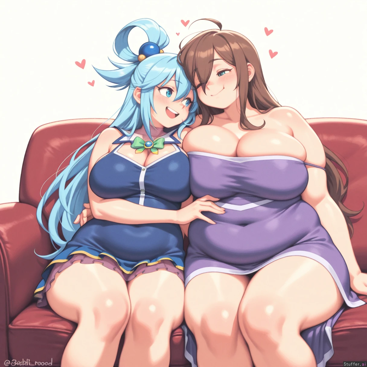 absurdres, 8k, perfect anatomy, masterpiece, beautiful face, beautiful eyes, noodlenood /(artist/) , (wamudraws /(artist/):1.0) 2 girls, couple, Lovebirds, Girl 1: (Wiz Konosuba), purple dress, big breasts, bursting breasts, (inflated breasts: 1.0), bbw, ssbbw, fat arms, fat legs, round face, fat cheeks, fat fingers, fat hands, (obese: 1.0), (bloated belly: 0.5), sitting on sofa Girl 2: blue dress, ((Aqua from Konosuba)), slim, hugging ((plain white background)), Mutual love, love each other, happy,