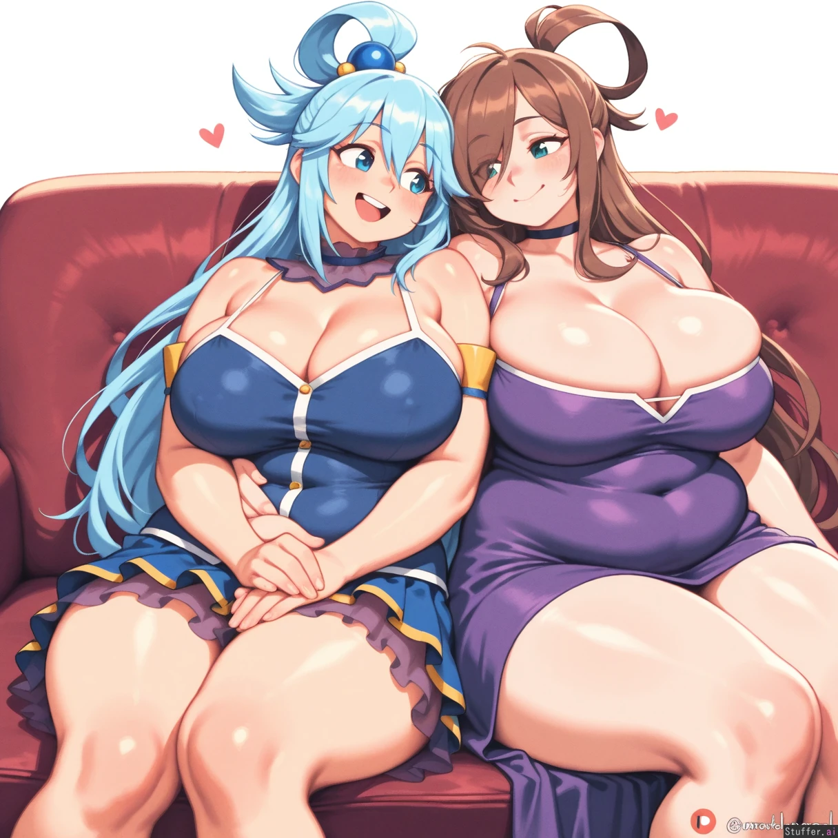 absurdres, 8k, perfect anatomy, masterpiece, beautiful face, beautiful eyes, noodlenood /(artist/) , (wamudraws /(artist/):1.0) 2 girls, couple, Lovebirds, Girl 1: (Wiz Konosuba), purple dress, big breasts, bursting breasts, (inflated breasts: 1.0), bbw, ssbbw, fat arms, fat legs, round face, fat cheeks, fat fingers, fat hands, (obese: 1.0), (bloated belly: 0.5), sitting on sofa Girl 2: blue dress, ((Aqua from Konosuba)), slim, hugging ((plain white background)), Mutual love, love each other, happy,