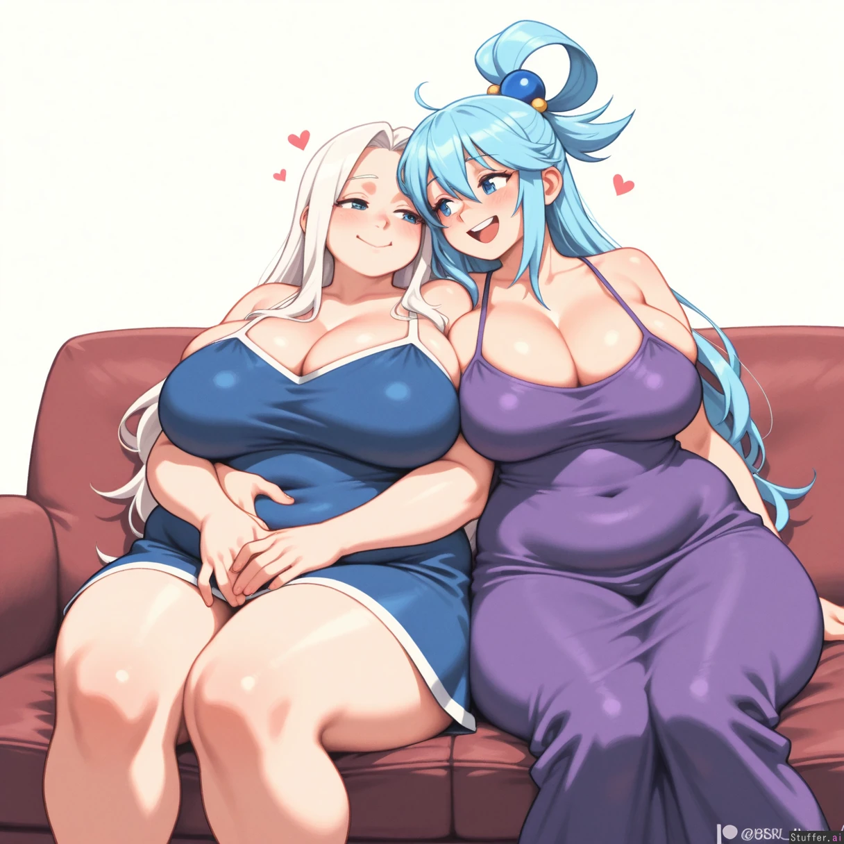 absurdres, 8k, perfect anatomy, masterpiece, beautiful face, beautiful eyes, noodlenood /(artist/) , (wamudraws /(artist/):1.0) 2 girls, couple, Lovebirds, Girl 1: (Wiz Konosuba), purple dress, big breasts, bursting breasts, (inflated breasts: 1.0), bbw, ssbbw, fat arms, fat legs, round face, fat cheeks, fat fingers, fat hands, (obese: 1.0), (bloated belly: 0.5), sitting on sofa Girl 2: blue dress, ((Aqua from Konosuba)), slim, hugging ((plain white background)), Mutual love, love each other, happy,