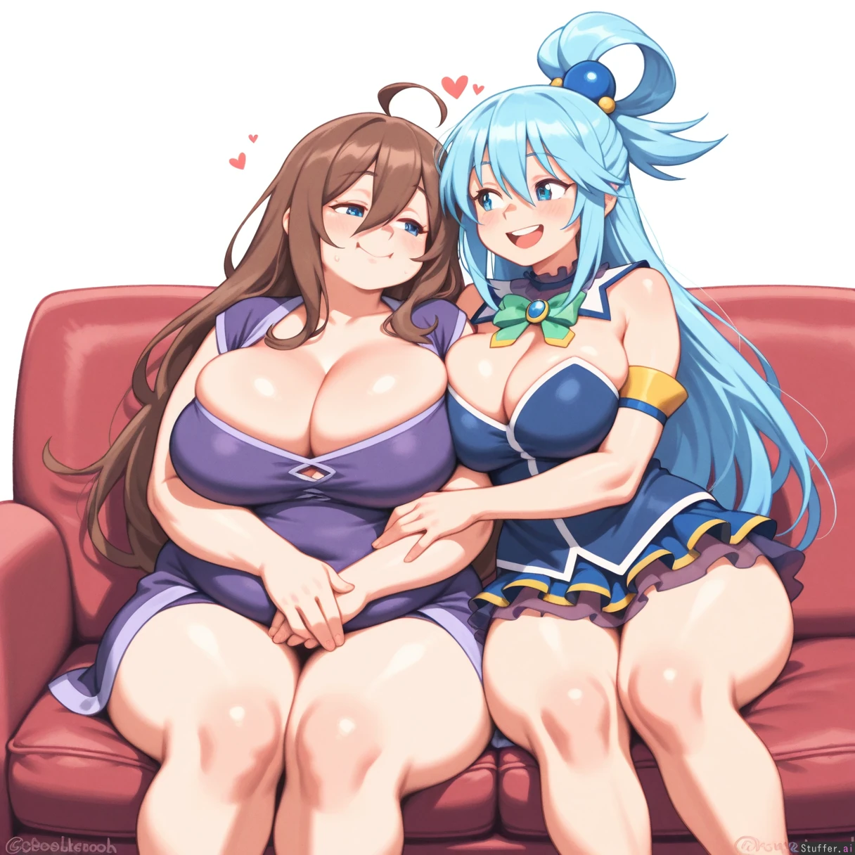 absurdres, 8k, perfect anatomy, masterpiece, beautiful face, beautiful eyes, noodlenood /(artist/) , (wamudraws /(artist/):1.0) 2 girls, couple, Lovebirds, Girl 1: (Wiz Konosuba), purple dress, big breasts, bursting breasts, (inflated breasts: 1.0), bbw, ssbbw, fat arms, fat legs, round face, fat cheeks, fat fingers, fat hands, (obese: 1.0), (bloated belly: 0.5), sitting on sofa Girl 2: blue dress, ((Aqua from Konosuba)), slim, hugging ((plain white background)), Mutual love, love each other, happy,