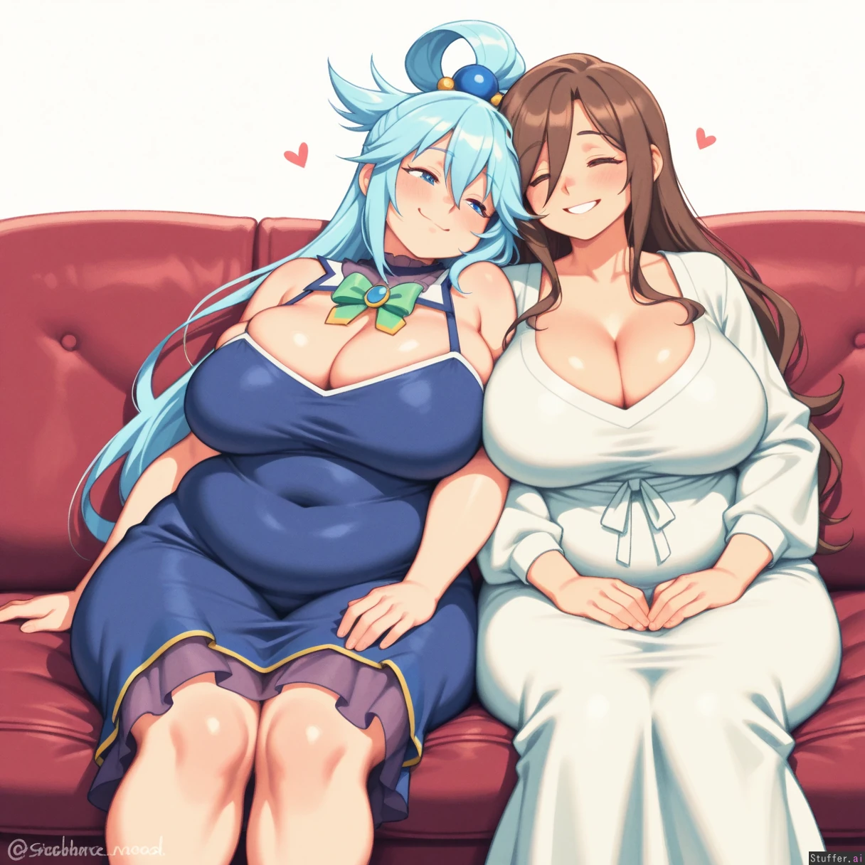 absurdres, 8k, perfect anatomy, masterpiece, beautiful face, beautiful eyes, noodlenood /(artist/) , (wamudraws /(artist/):1.0) 2 girls, couple, Lovebirds, Girl 1: (Wiz from Konosuba), purple long dress, big breasts, bursting breasts, (inflated breasts: 1.0), bbw, ssbbw, fat arms, fat legs, round face, fat cheeks, fat fingers, fat hands, (obese: 1.0), (bloated belly: 0.5), sitting on sofa Girl 2: blue dress, ((Aqua from Konosuba)), slim, holdimg hand ((plain white background)), Mutual love, love each other, happy,