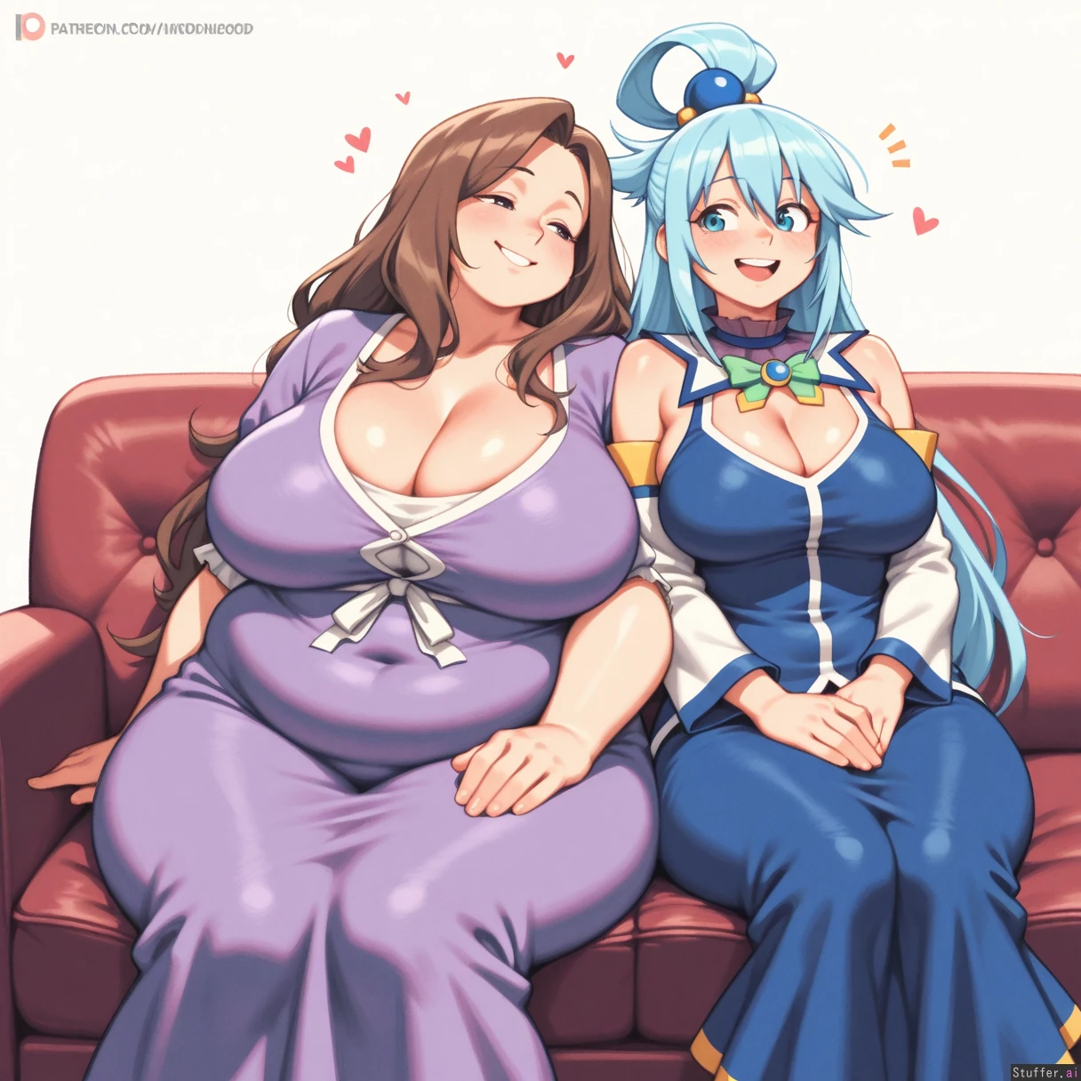 absurdres, 8k, perfect anatomy, masterpiece, beautiful face, beautiful eyes, noodlenood /(artist/) , (wamudraws /(artist/):1.0) 2 girls, couple, Lovebirds, Girl 1: (Wiz from Konosuba), purple long dress, big breasts, bursting breasts, (inflated breasts: 1.0), bbw, ssbbw, fat arms, fat legs, round face, fat cheeks, fat fingers, fat hands, (obese: 1.0), (bloated belly: 0.5), sitting on sofa Girl 2: blue dress, ((Aqua from Konosuba)), slim, holdimg hand ((plain white background)), Mutual love, love each other, happy,