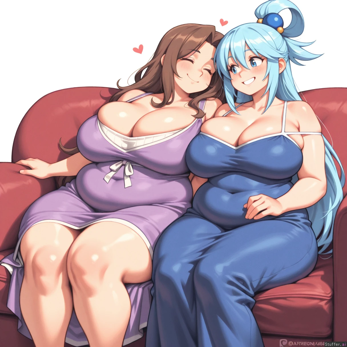 absurdres, 8k, perfect anatomy, masterpiece, beautiful face, beautiful eyes, noodlenood /(artist/) , (wamudraws /(artist/):1.0) 2 girls, couple, Lovebirds, Girl 1: (Wiz from Konosuba), purple long dress, big breasts, bursting breasts, (inflated breasts: 1.0), bbw, ssbbw, fat arms, fat legs, round face, fat cheeks, fat fingers, fat hands, (obese: 1.0), (bloated belly: 0.5), sitting on sofa Girl 2: blue dress, ((Aqua from Konosuba)), slim, holdimg hand ((plain white background)), Mutual love, love each other, happy,