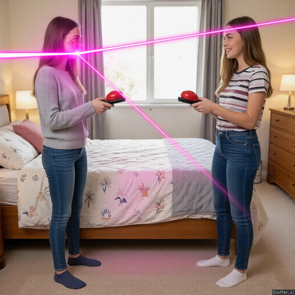 The left girl gets hit in her face by a pink lazer beam coming from the left remote control
