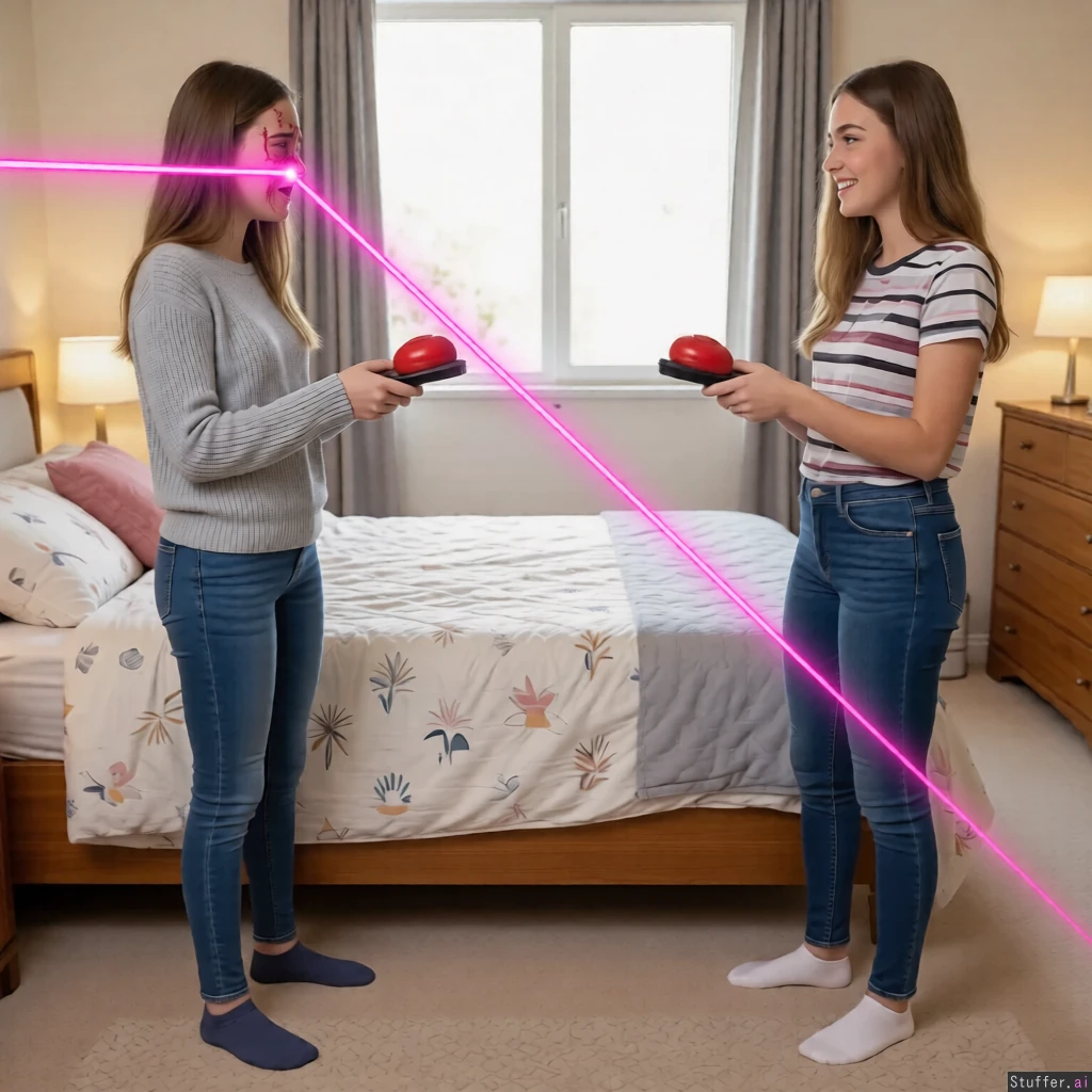 The left girl gets hit in her face by a pink lazer beam that is coming from the left remote control