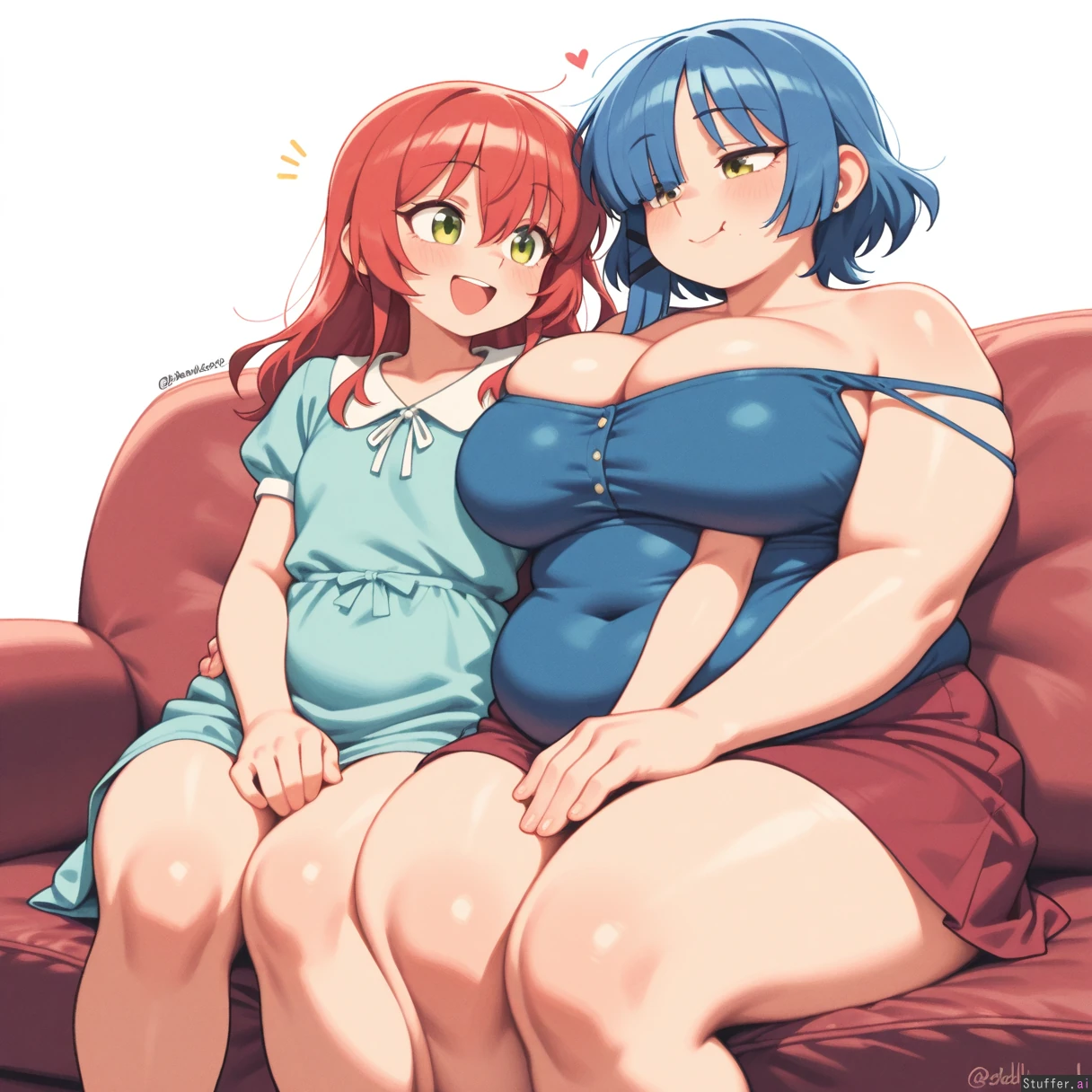 absurdres, 8k, perfect anatomy, masterpiece, beautiful face, beautiful eyes, noodlenood /(artist/) , (wamudraws /(artist/):1.0) 2 girls, couple, Lovebirds, Girl 1: (Yamada Ryo), blue dress, big breasts, bursting breasts, (inflated breasts: 1.0), bbw, ssbbw, fat arms, fat legs, round face, fat cheeks, fat fingers, fat hands, (obese: 1.0), (bloated belly: 0.5), sitting on sofa Girl 2: red dress, ((Kita Ikuyo)), slim, holdimg hand ((plain white background)), Mutual love, love each other, happy,